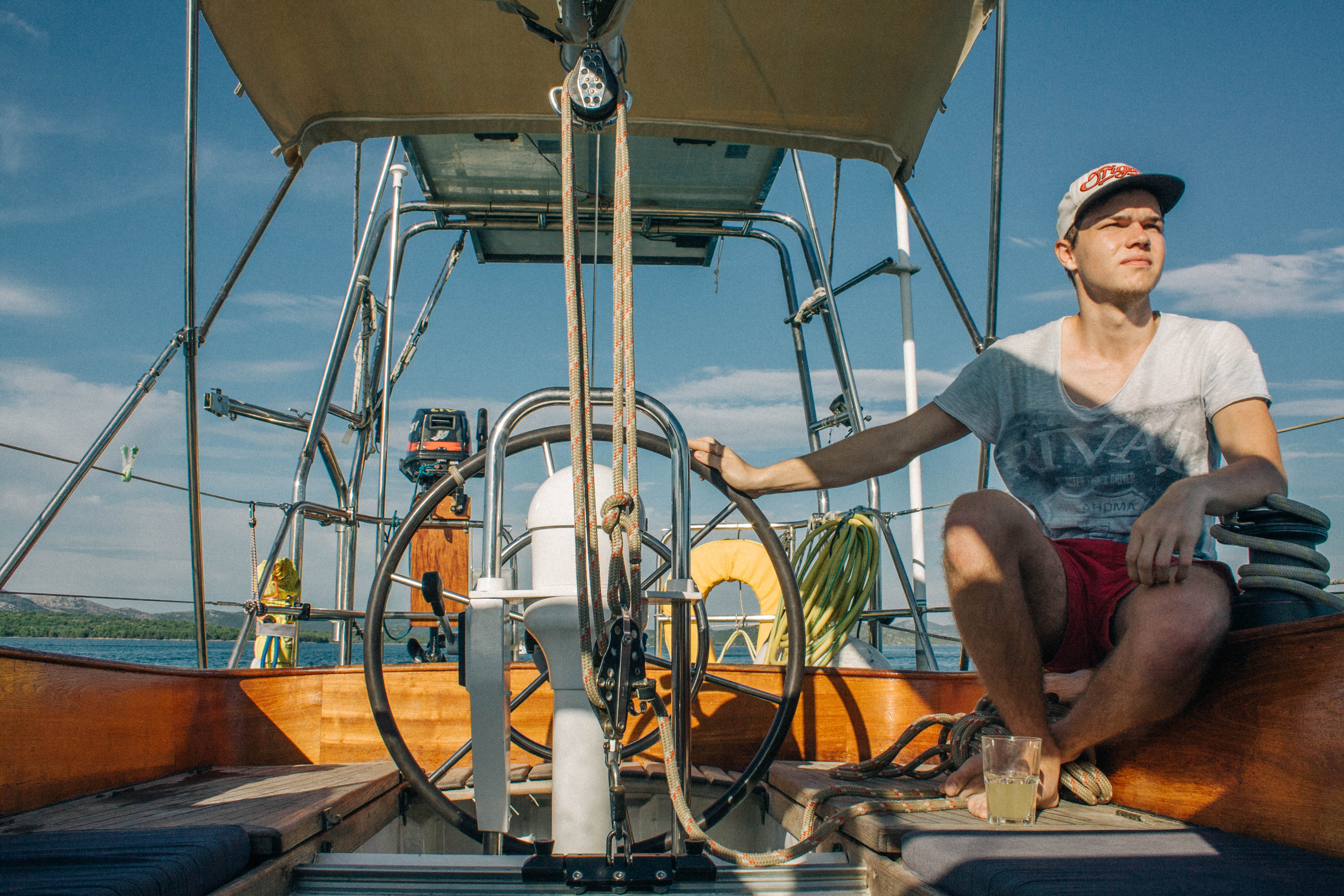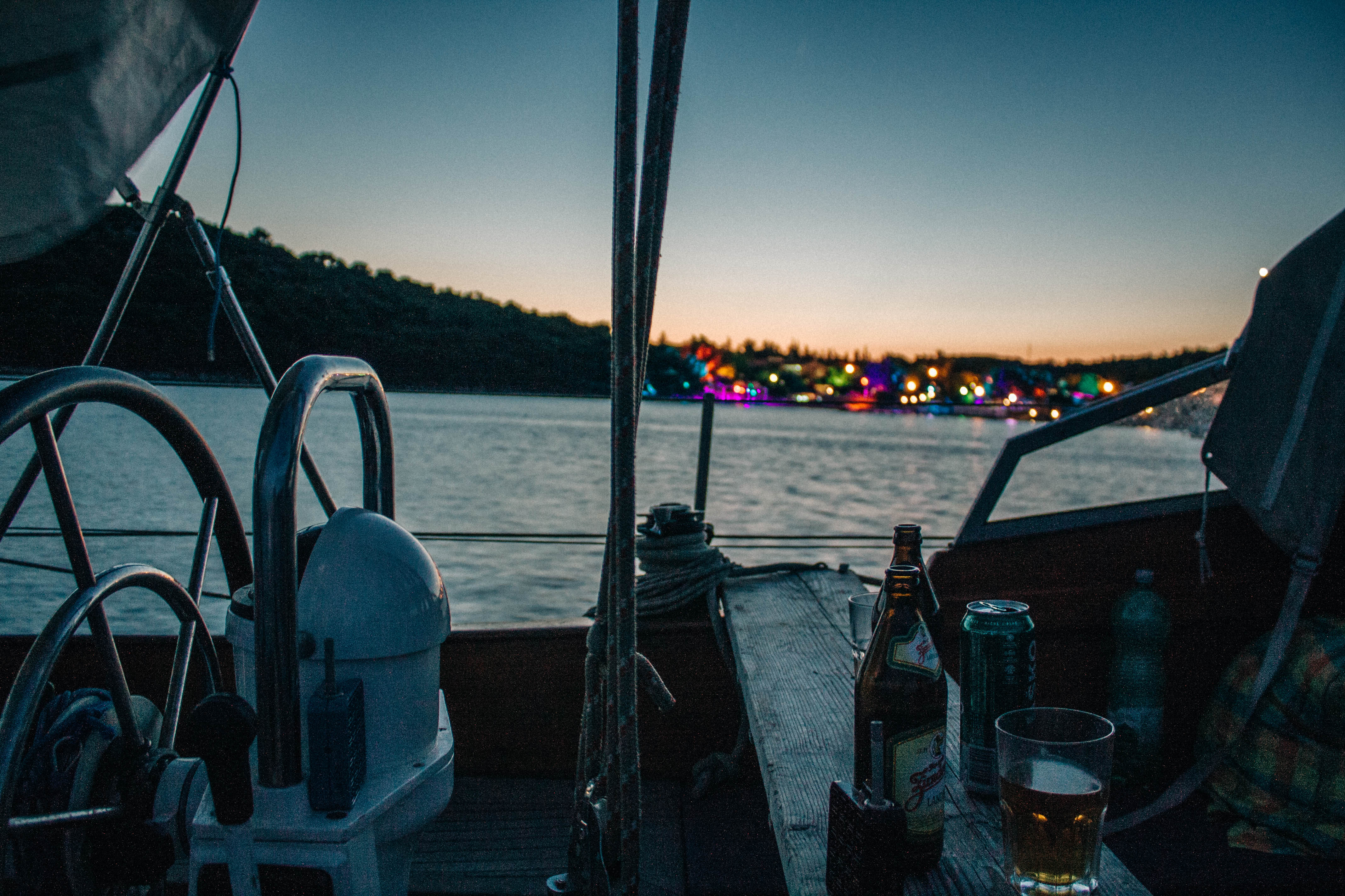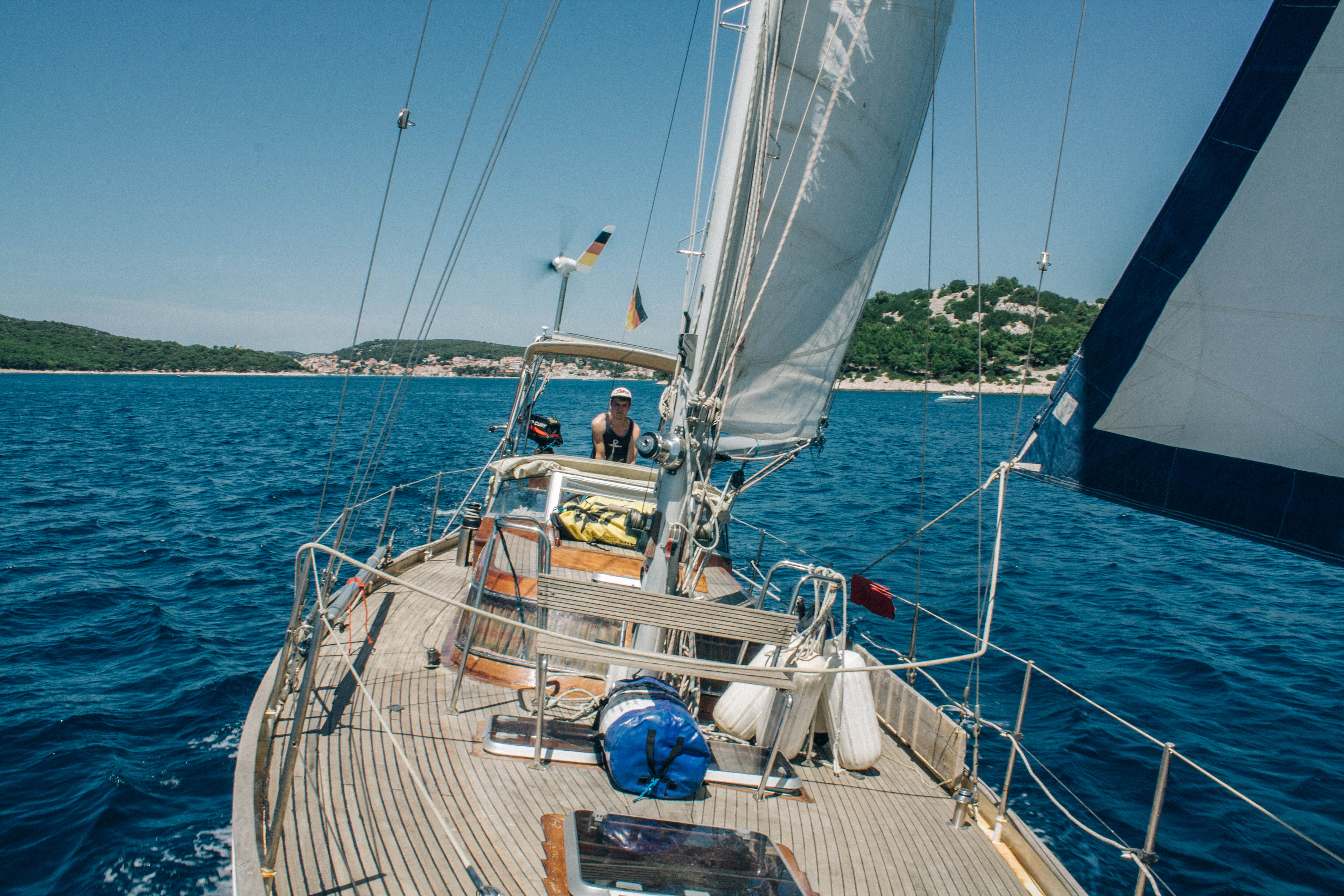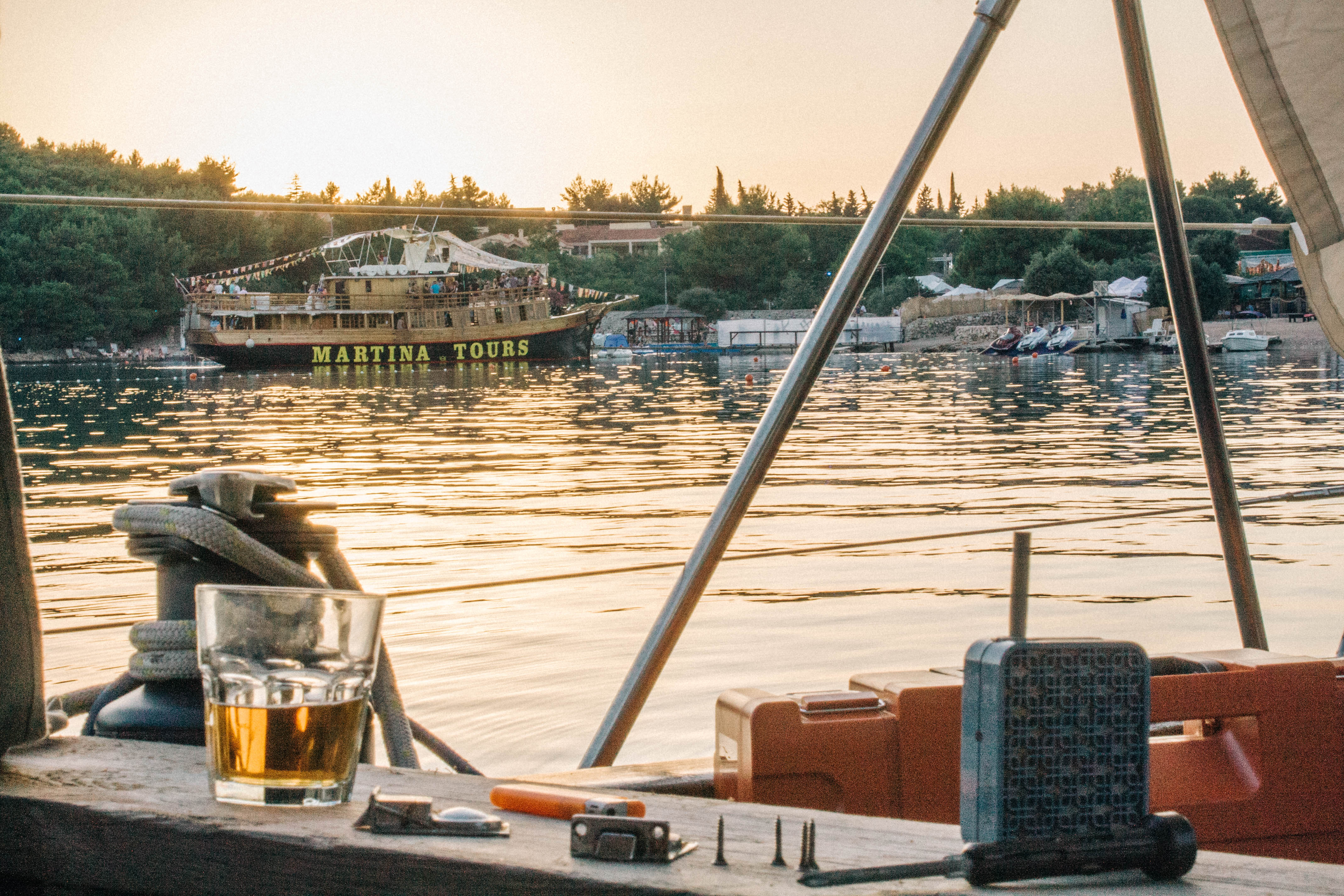 Buisiness before pleasure. We have a week full of work, we want to refresh our wooden deck. Because the previous owner used to oil the wooden deck, the fugues between the planks became brittle. Because we don’t want our deck to become leaky we have to renew all the fugues! The bad news first: All of them! The good news: we’re in Croatia where the weather is good and the sea is crystal clear! And we found out that there’s a festival in Tisno, on the other side of the island. Maybe the week won’t be as bad as we imagined it would be! As we sail around the island Murter we can hear the bass and the loud music miles before we reach Tisno, and weg et more and more excited! This is a rough schedule oft he following two days: