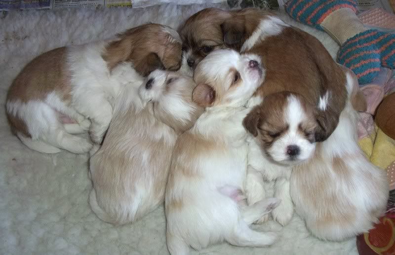4 weeks old with her brothers and sisters, before we could bring her home. Ruby is the one with the Marlene Dietrich eyebrows!
