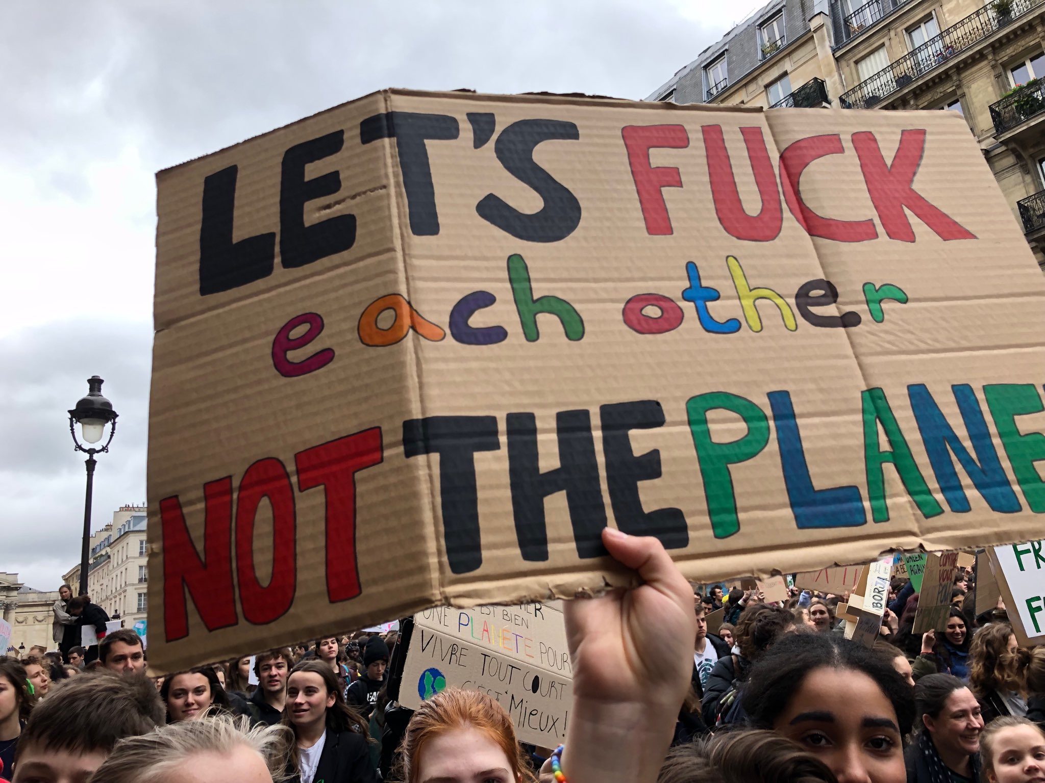 Today millions of students were marching in the streets brandishing panels with colourful catchphrases in order to defend their/our right for a survivable future on this planet. As to this specific motto : okay kids, but with a condom! Overpopulation will only increase global warming !