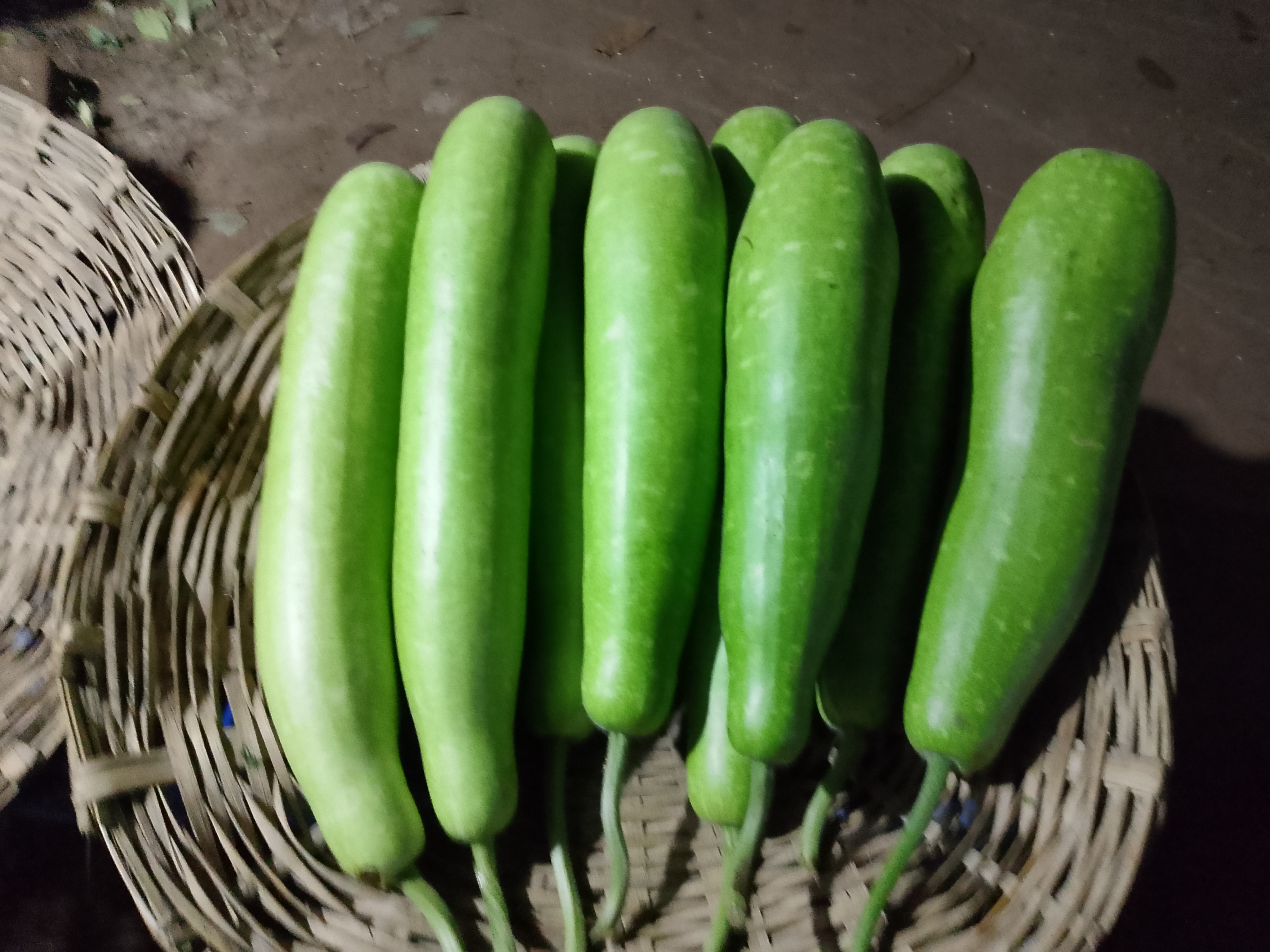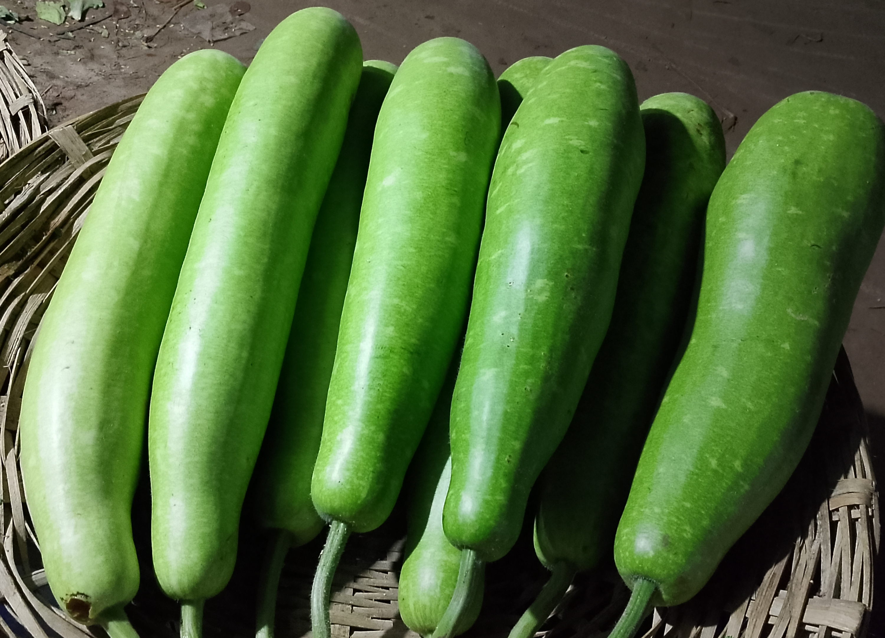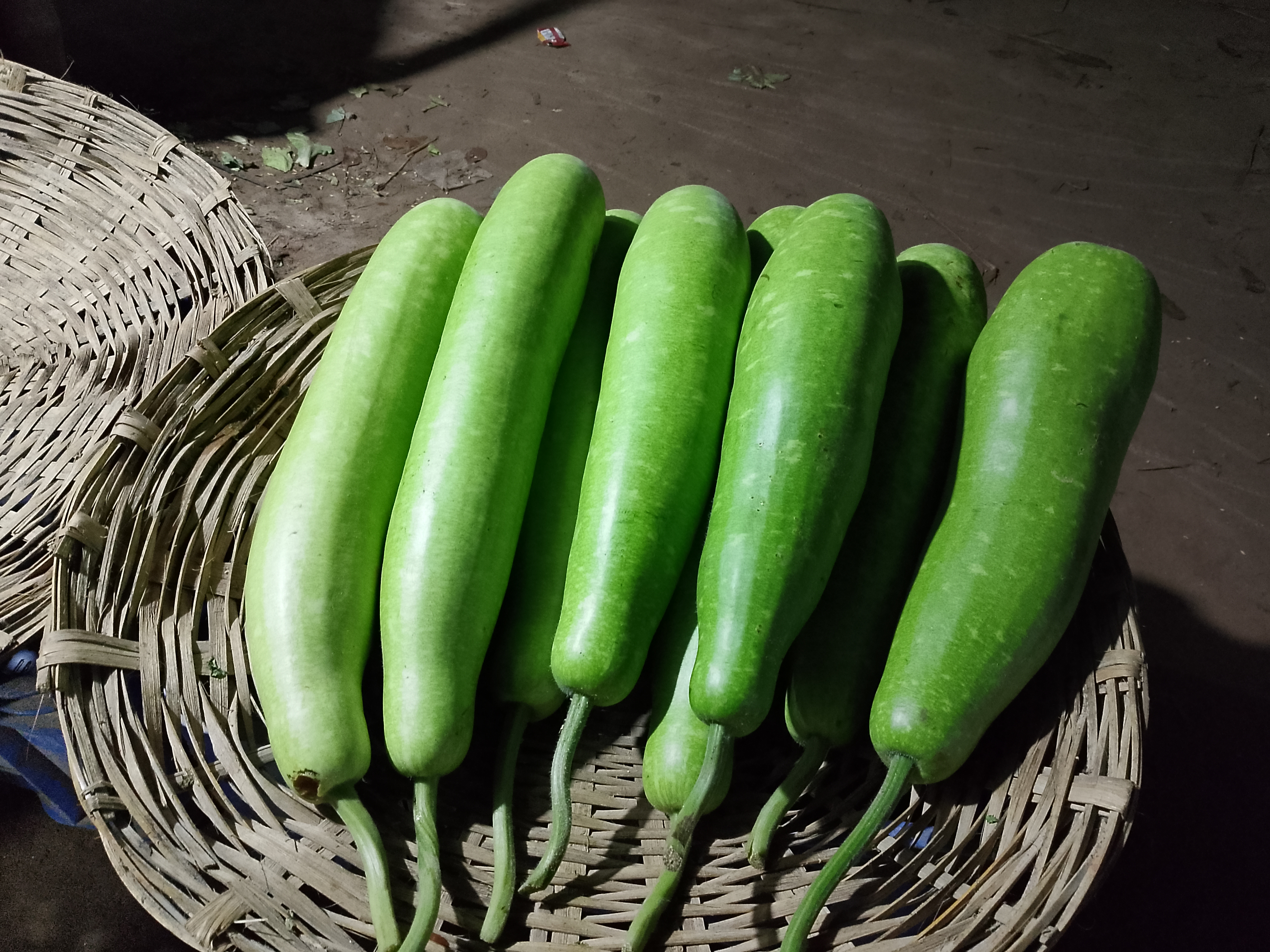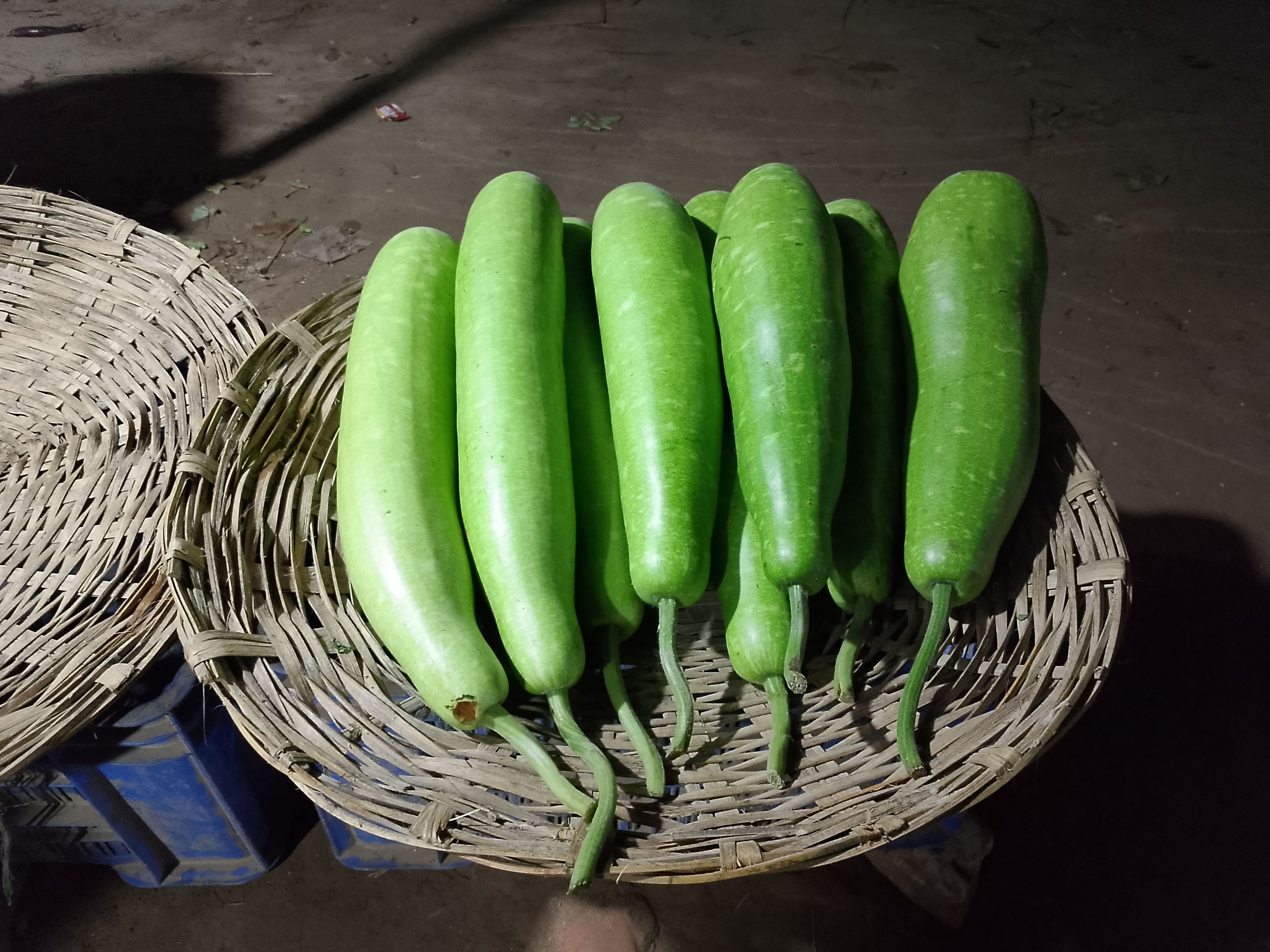 New pumpkins have arrived. Many of them are quite long and in very good shape. These pumpkins were brought to the market for selling and kept inside a bamboo basket (changari) for sale.