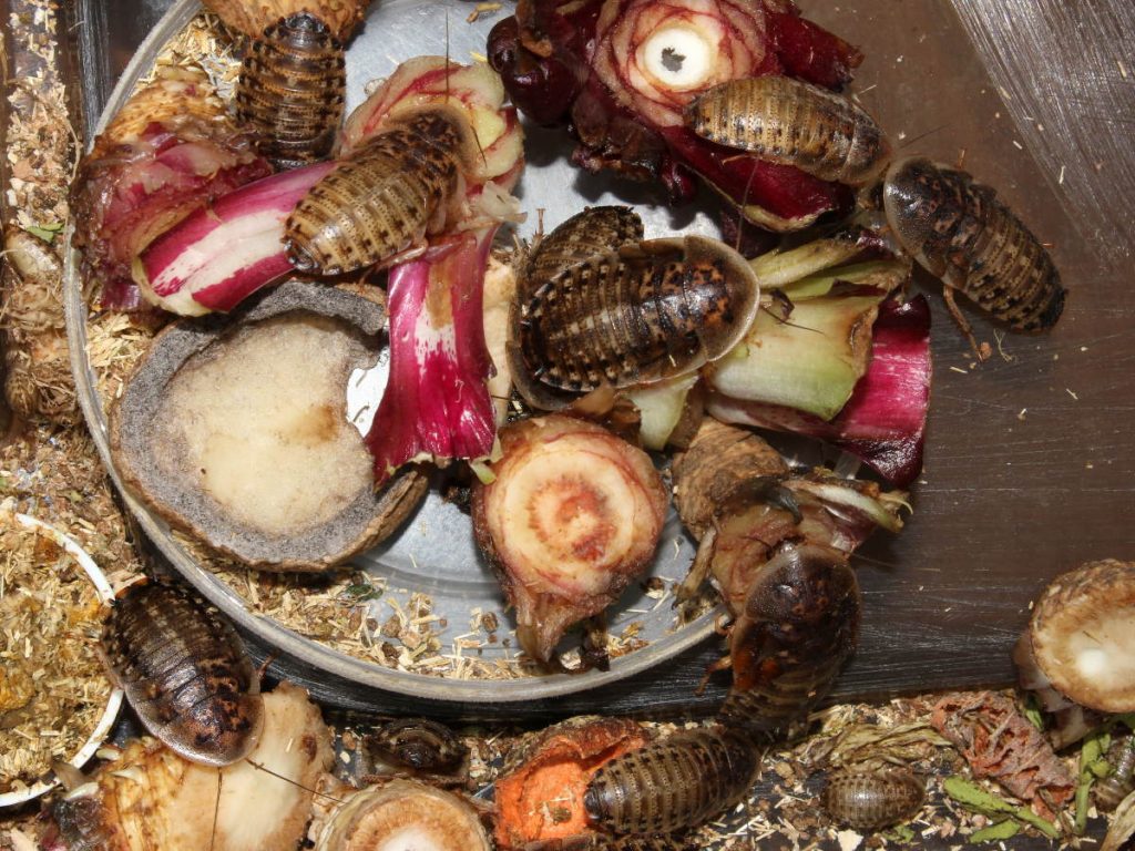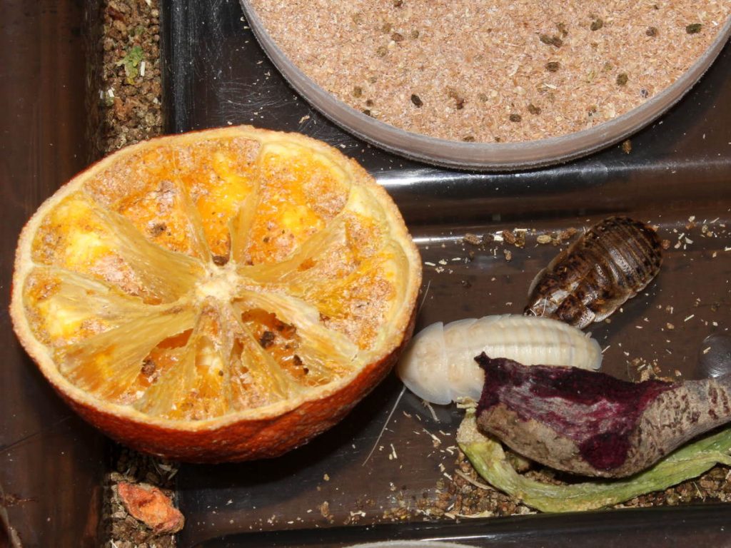 Dubia roaches love to eat oranges, they can devour orange in less than an hour. Same goes for carrots, lettuce or tomato. They also like to eat wheat bran or any kind of crushed grain. I don’t give them water gel as a source of water, instead, they receive fresh vegetables and fruit daily. I also refuse to offer them protein rich feed which can become harmful to the roaches in high amounts. They can easily get everything they need from other sources, they are roaches after all. Buggers even chew on their egg crates from time to time.