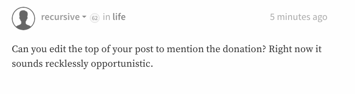 Can you edit the top of your post to mention the donation? Right now it sounds recklessly opportunistic.