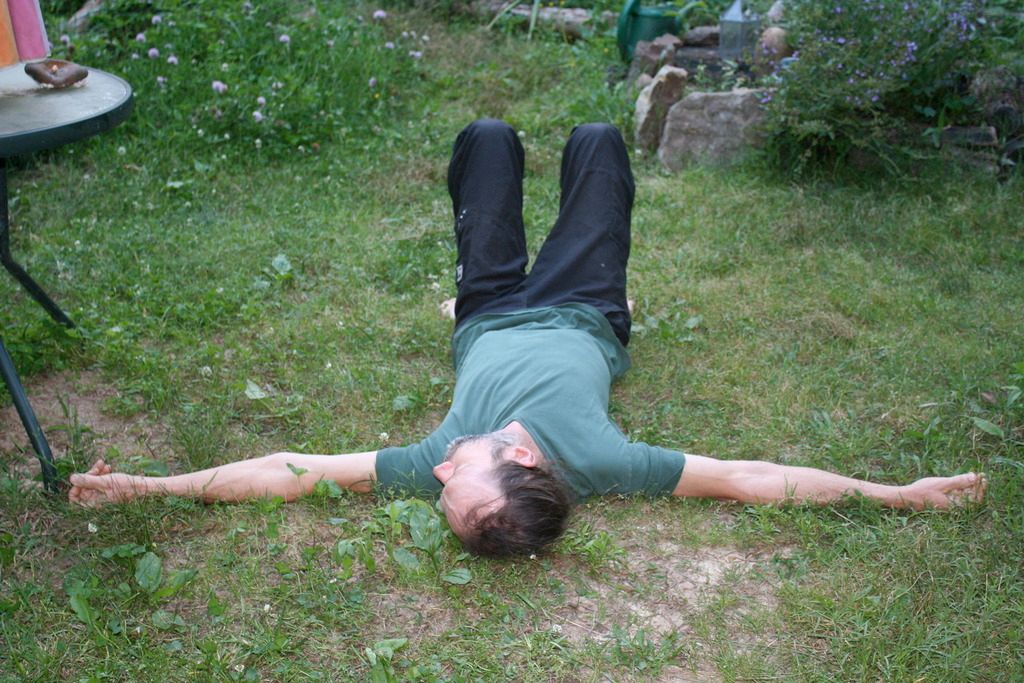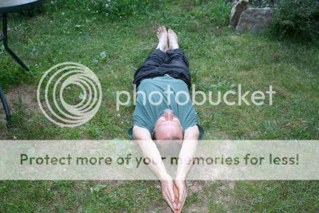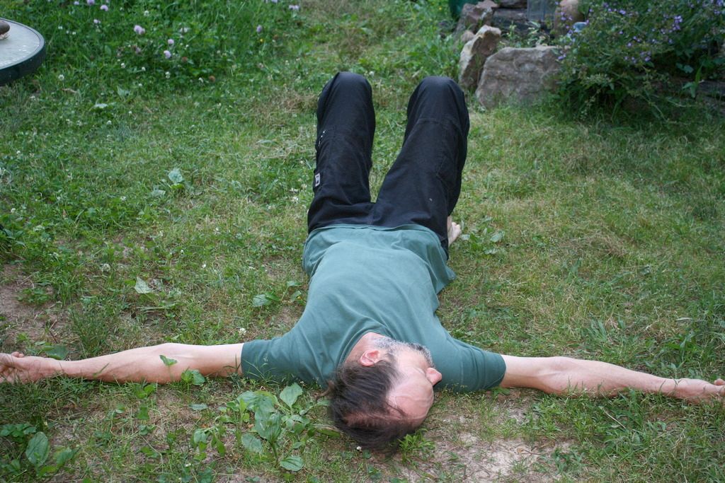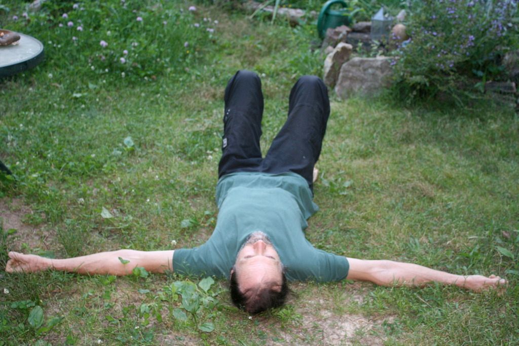 First I lie down on some carpet, the floor, or right in the grass-- as long as it's firm support. I do my best to relax all of the tensed muscles in my back, but they sense that something is up, and are ready to tense back up if there's any movement. They act as sentries around the spine, but eventually they'll let me pass so that we can all relax.