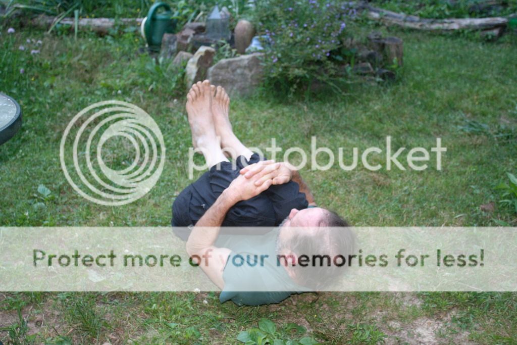 'CLOINK!' Step 7. - Now curl up and hold knees to chest, head forward, and rock and roll on the lower back a few times: