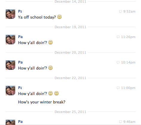 Greetings people of steemit. As my first post here I'd like to post a chat log between me and my ex-stalker that may be hard to keep reading. I have posted this once before on reddit but it will be some original content here. A little background: I met him in high school. He got attached to me my senior year and as I went to college he started waiting by my house when I came home for me. I then proceed to dodge him however he applied to my college, got in, and tried to stalk me there. I hope you enjoy this yearlong cringefest.