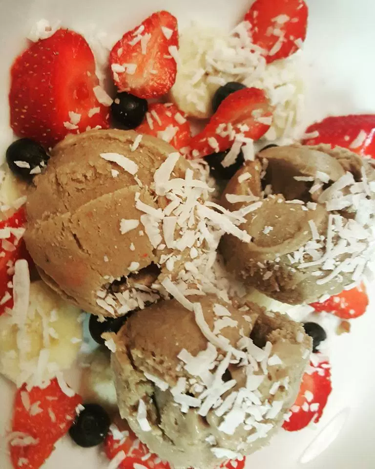 Next in mixing bowl or by hand whisk together coconut milk,sugar, banana, SunButter, and vanilla in a large bowl then set mixture in the fridge for 1 hour, or overnight to chill.Slowly pour mixture into pre-frozen ice cream machine bowl and let the mixture churn until it reaches desired ice cream consistency (25 minutes).