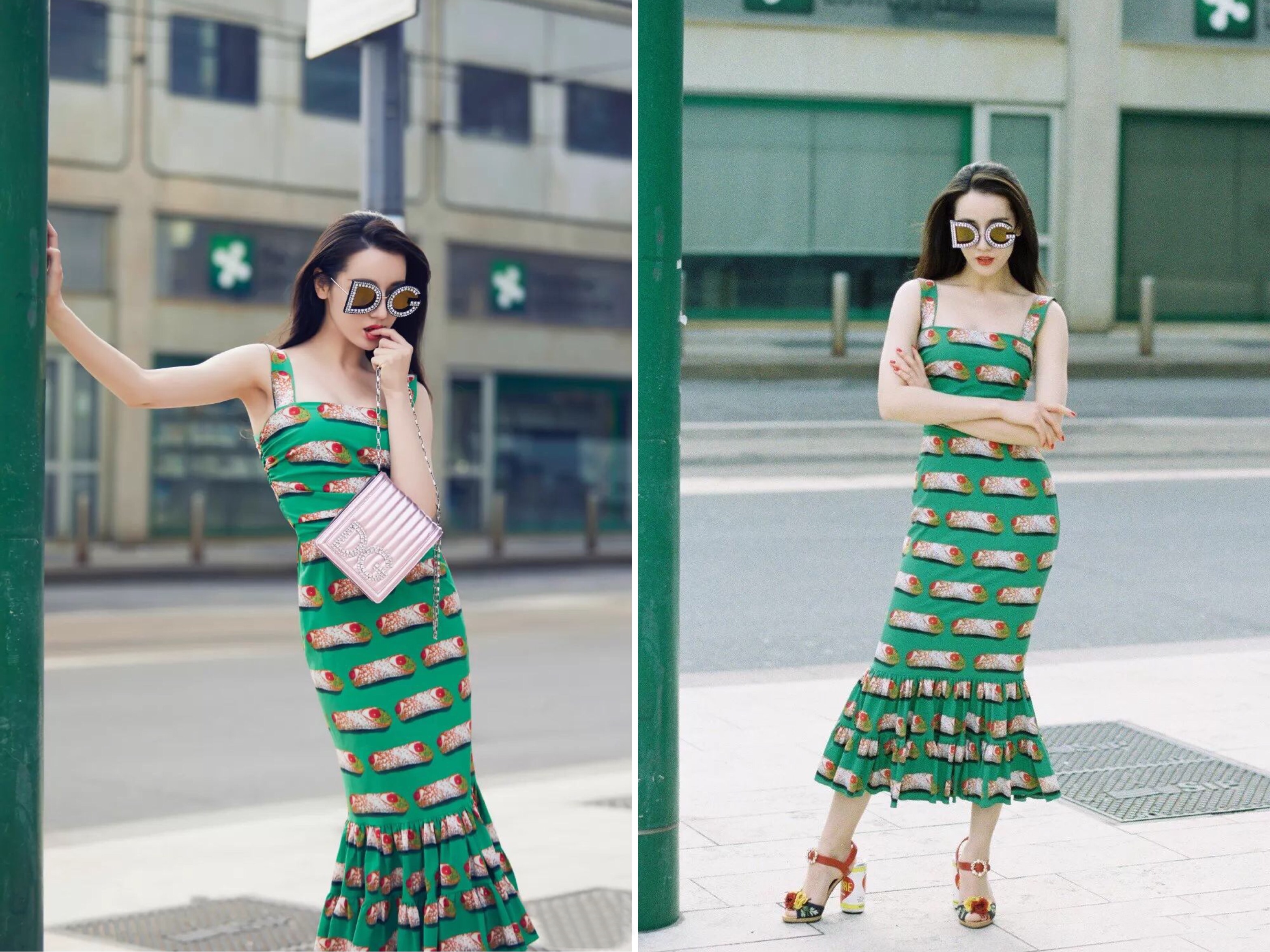 也许这样完美的脸庞,如果穿上低调朴素的服装,倒是浪费了这副好身材和这张有辨识度的脸。这一袭杜嘉班纳的绿色吊带连衣长裙,宽肩带的设计,有些复古也非常有女人味,露出好看的香肩锁骨线条,别说是男生看了,女生看见都流口水吧,非常撩人。