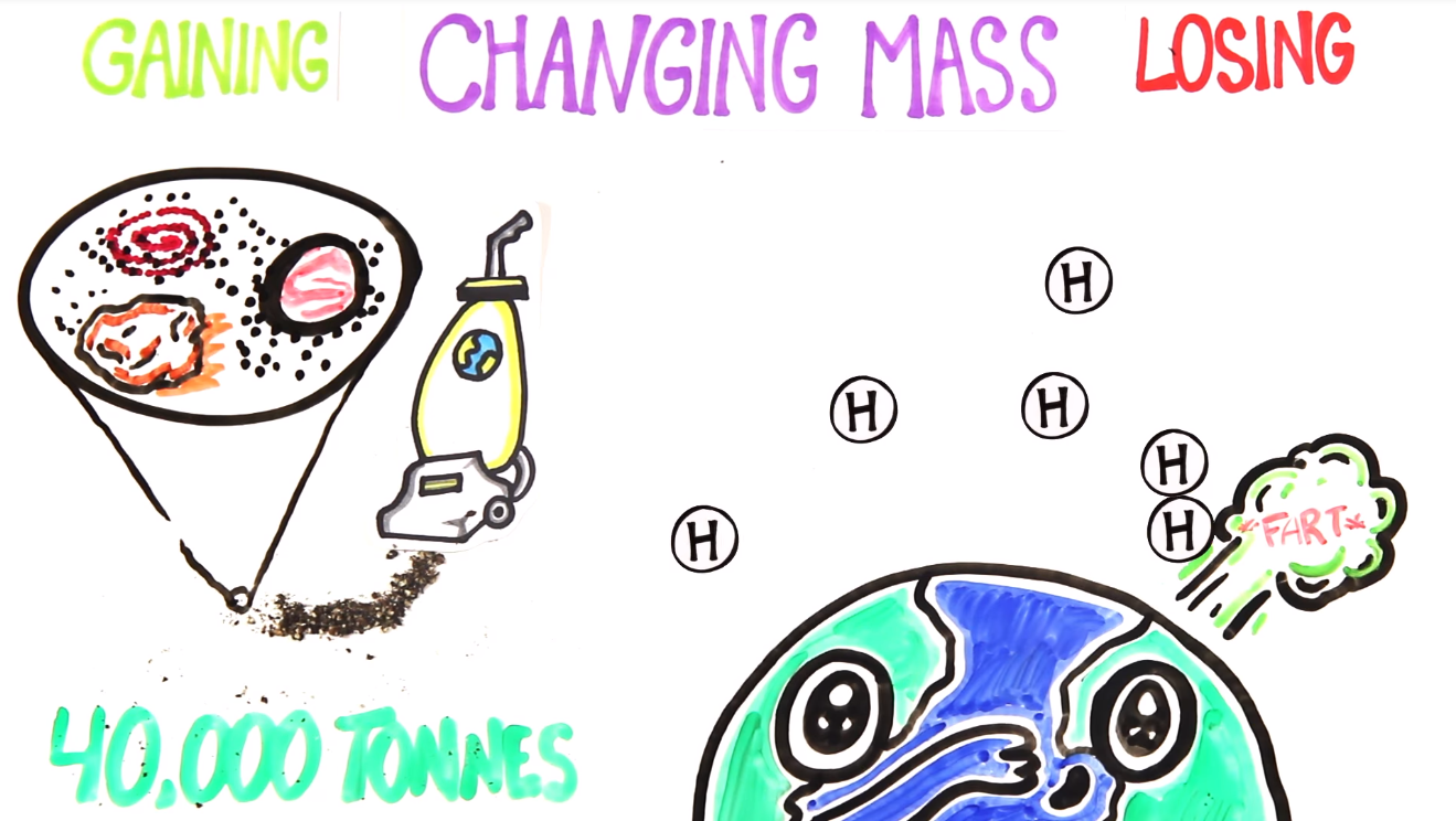 However, our planet is continually gaining and losing mass. We take on an estimated 40,000 tonnes of space dust that the earth’s gravity pulls in like a giant vacuum - this dust is vestiges of our solar system, broken up asteroids and the matter that never turned into planets. But we lose mass largely due to gases (farting earth drawing). Gases like hydrogen are so light that they are escaping through the atmosphere at a rate of 3 kg per second - that’s 95,000 tonnes a year.