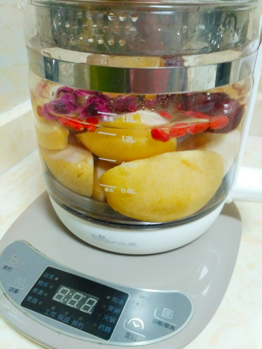 我是按照自己的个人口味准备了材料:红枣、枸杞、梨、玫瑰花、冰糖、鸡蛋