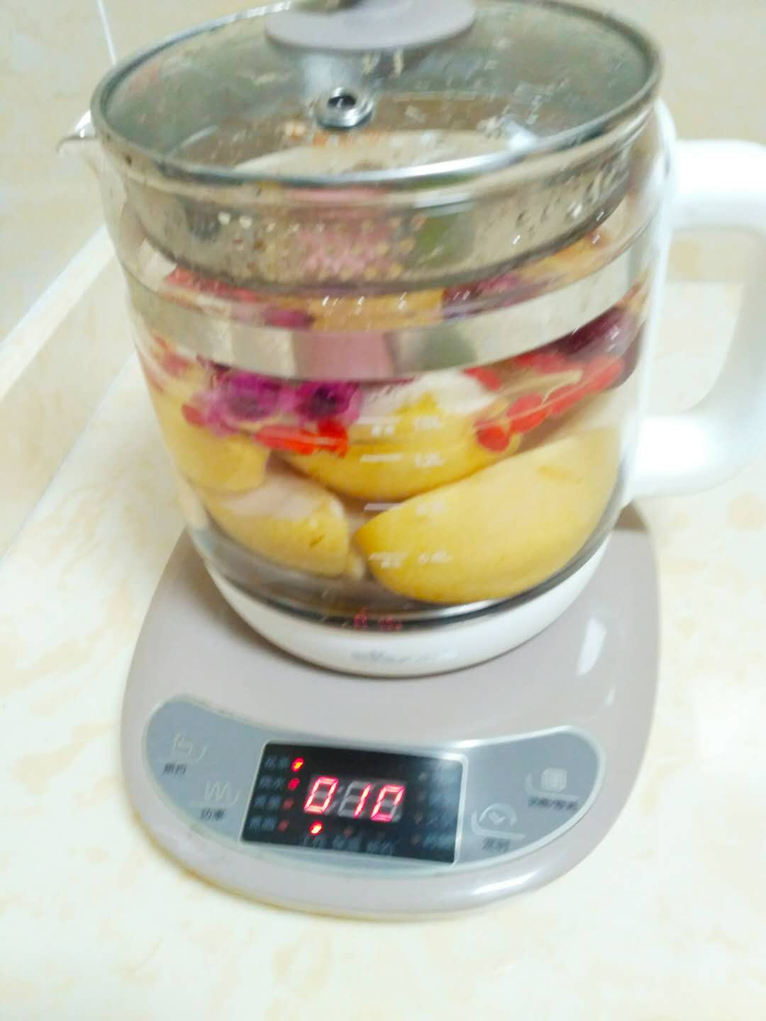 全部都放在养生壶里。水放九分满。剩下5分钟左右把冰糖放进去。鸡蛋打散放进去。
