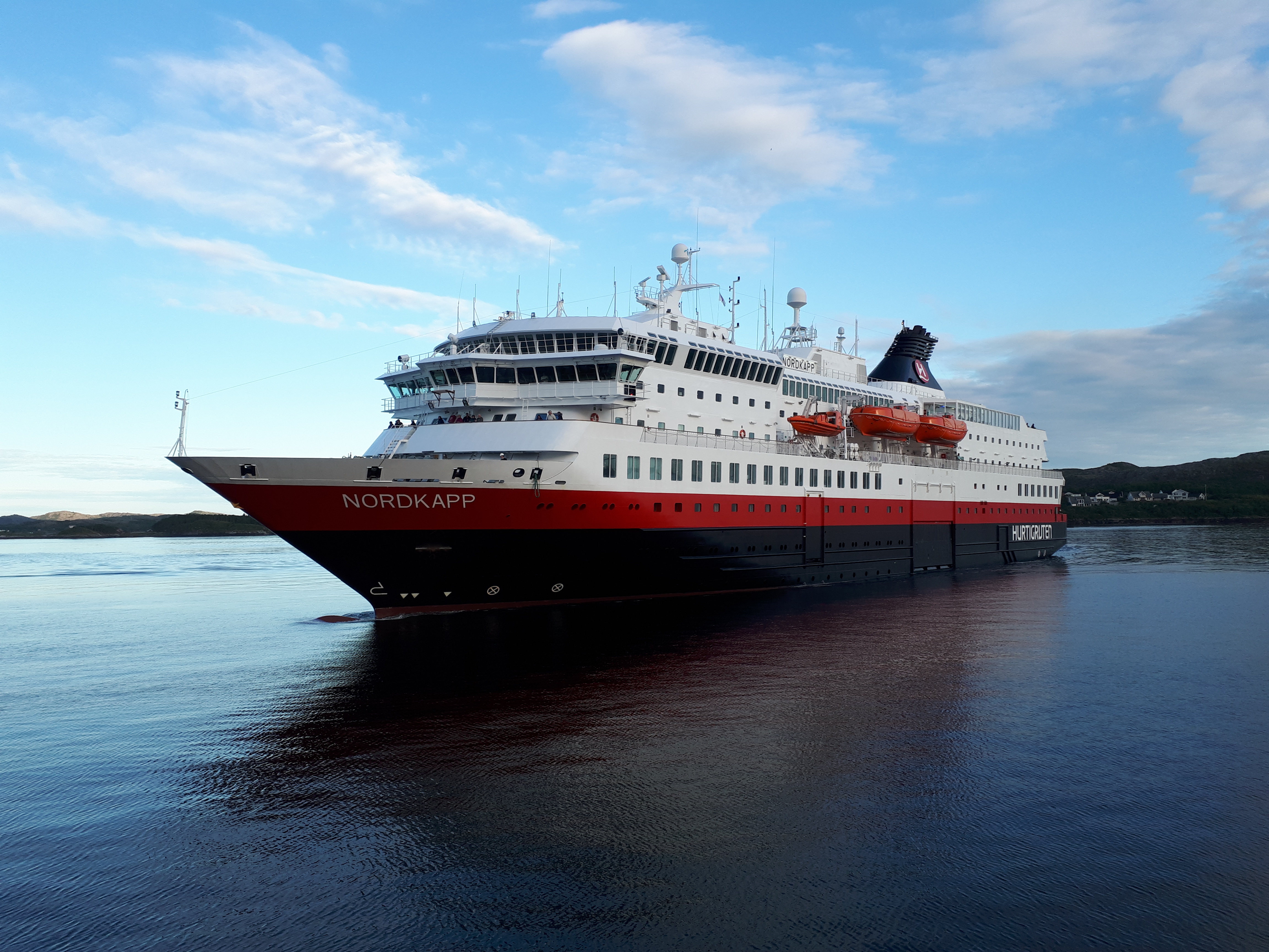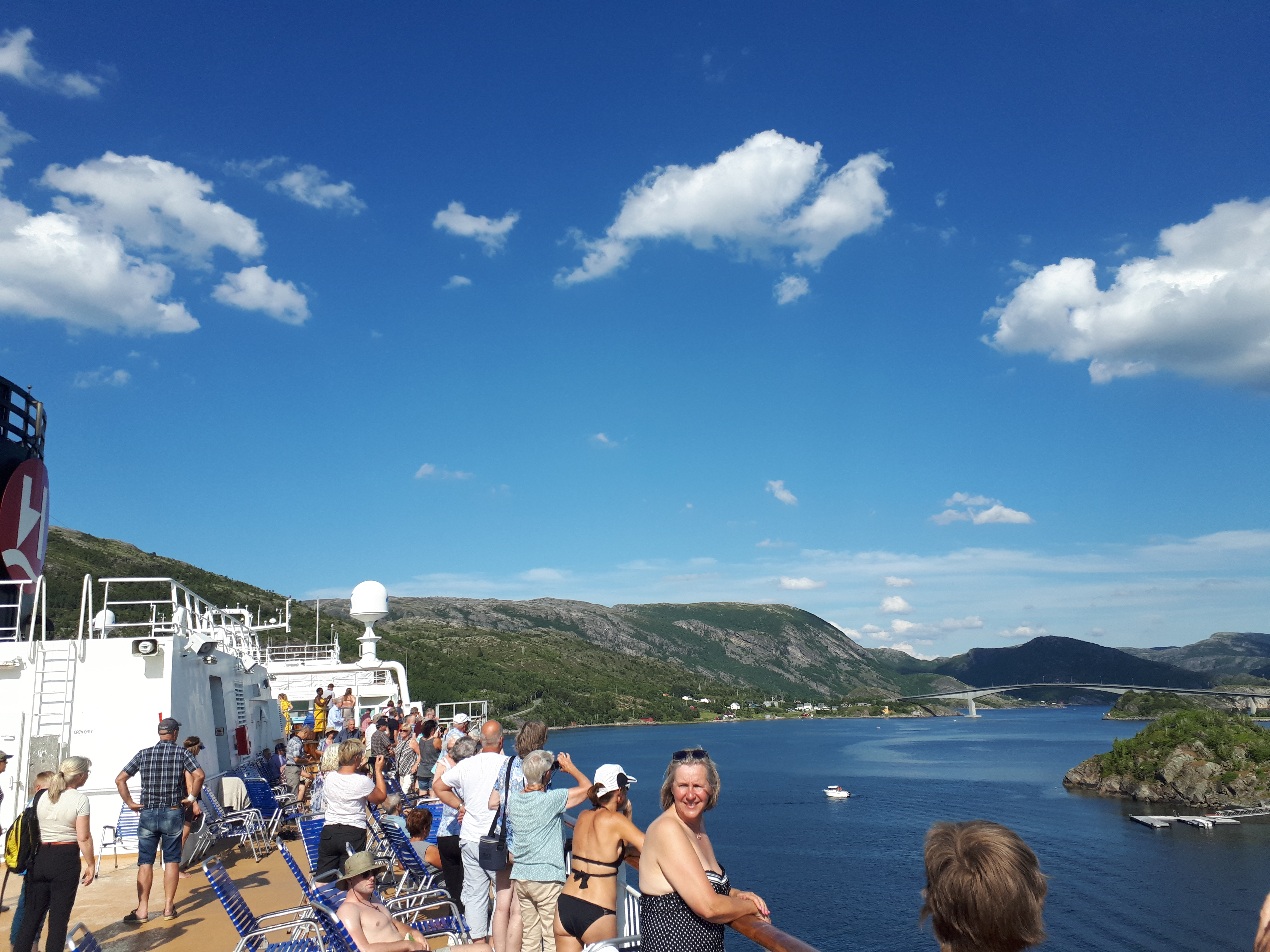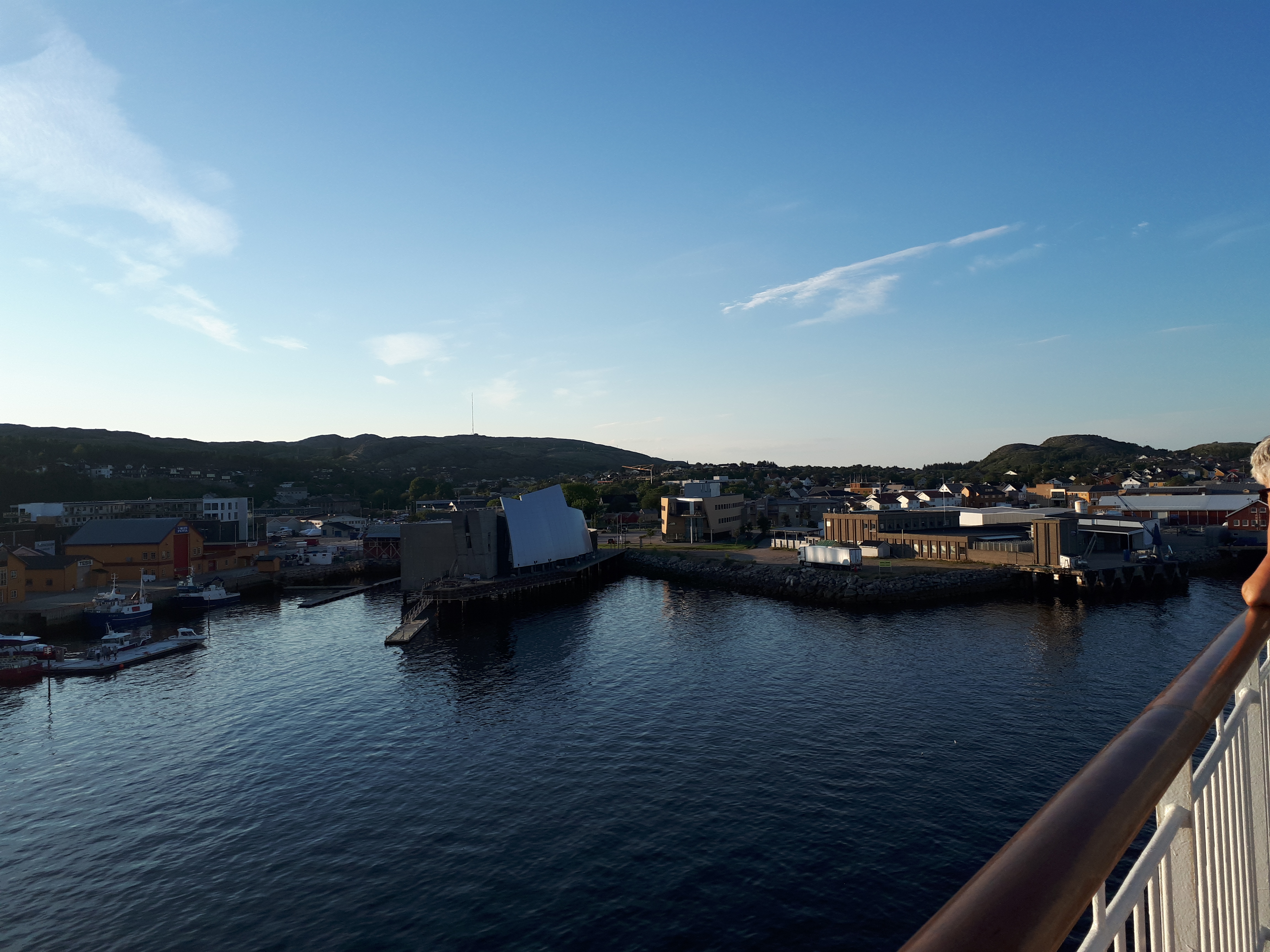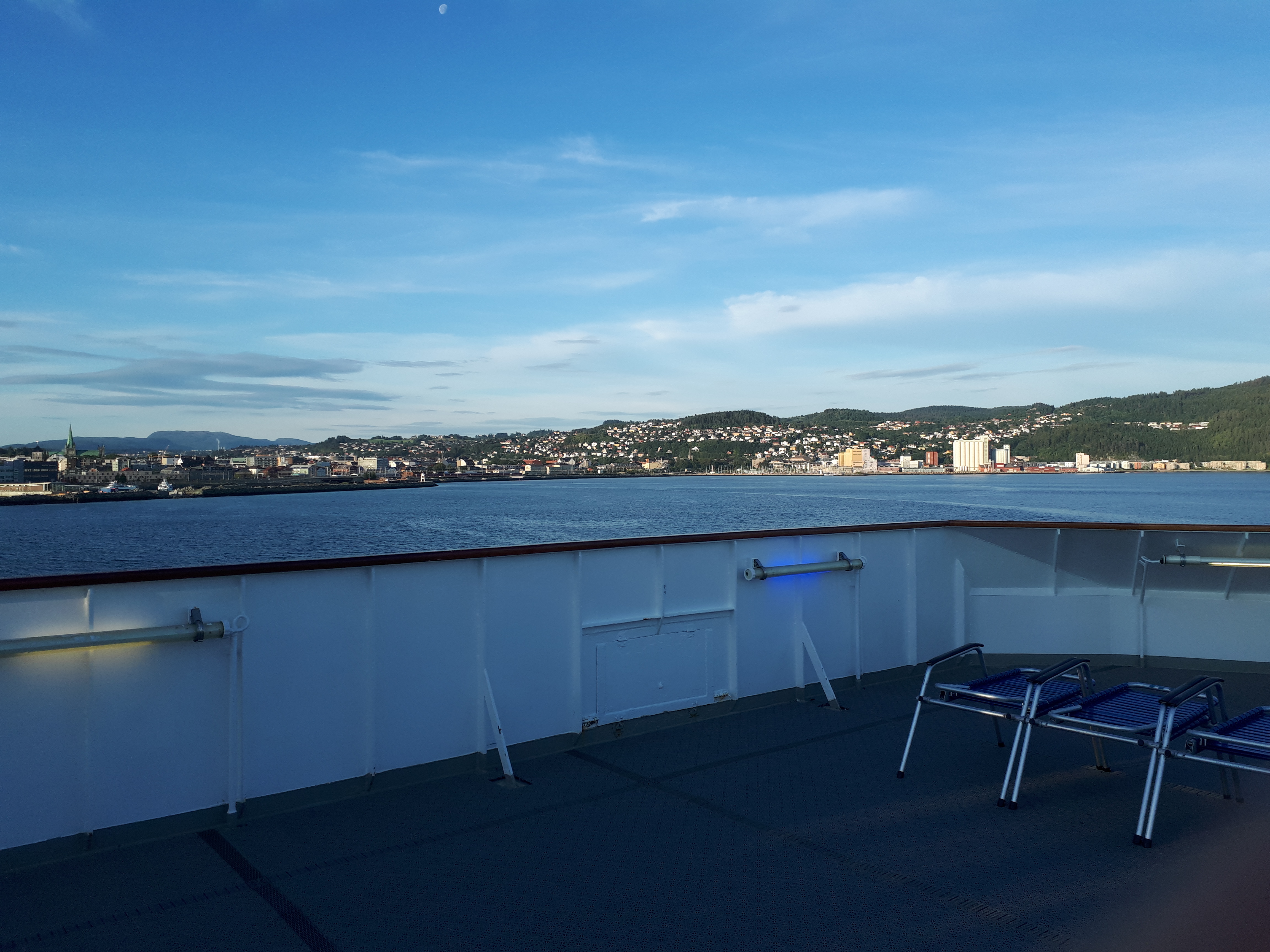 My original plan was to take the southbound ship but after checking the weather forecast I decided quite spontaneously to take the northbound ship instead. After some hectic packing I arrived at the harbour in Trondheim 15 minutes before departure. Luckily, I caught one of the newest ships of the Hurtigruten which means that there will be two whirlpools on the upper deck. The weather on this day was more like you would expect in the Carribean or Mediterranean Sea. It was almost 30 degrees and sunny.