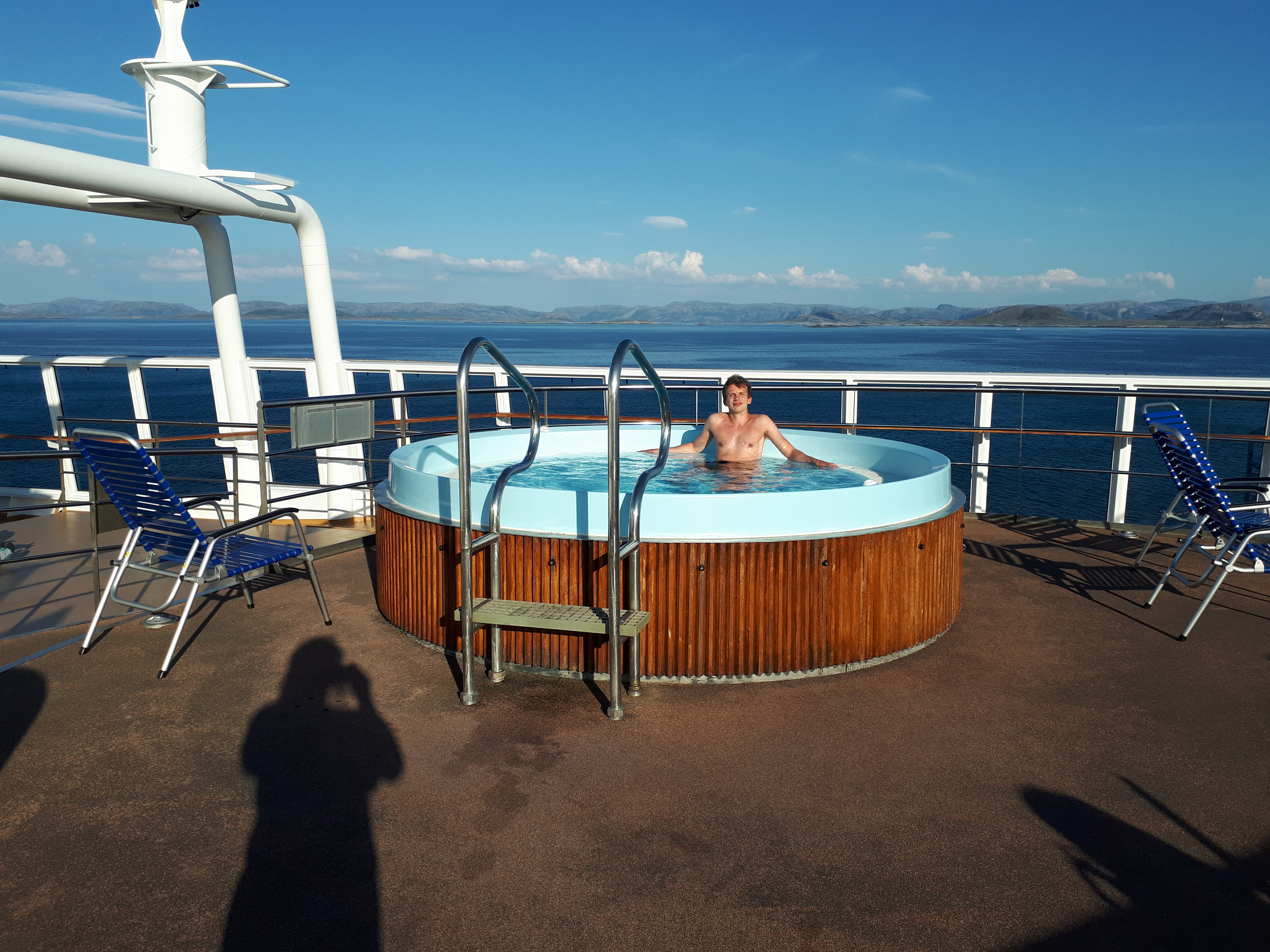 After 5 hours of observing the beautiful Norwegian coast line and sunbathing, I finally decided to go into one of the whirlpools. It would not be a cooling with a water temperature around 38 degrees but as the seawind became stronger it was quite nice. So the remaining 2 hours I enjoyed the time in the whirlpool.