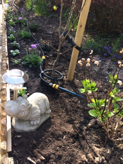 Here are a few pictures including some of what it looked whilst the flowers were still in their pots. We also bought a friendly hippo to keep us company - He needs a name, do you have any suggestions?