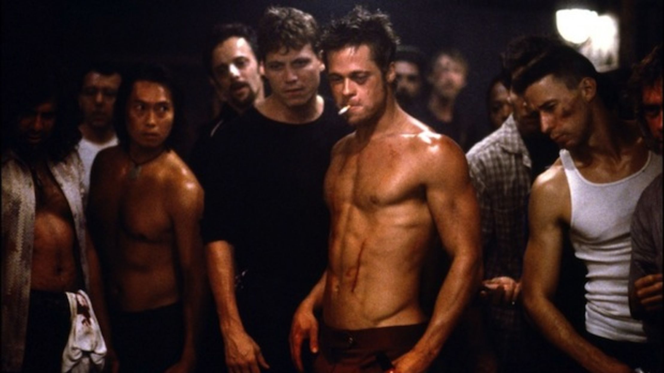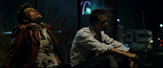In this bar scene, Edward (in white shirt) tells Tyler (red jacket) about what he lost in his apartment fire.