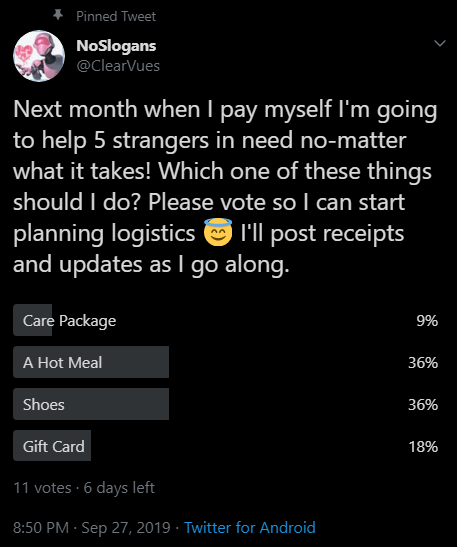 I put up a post on twitter asking people what I should give as my first attempt at giving. Please be kind and vote too.