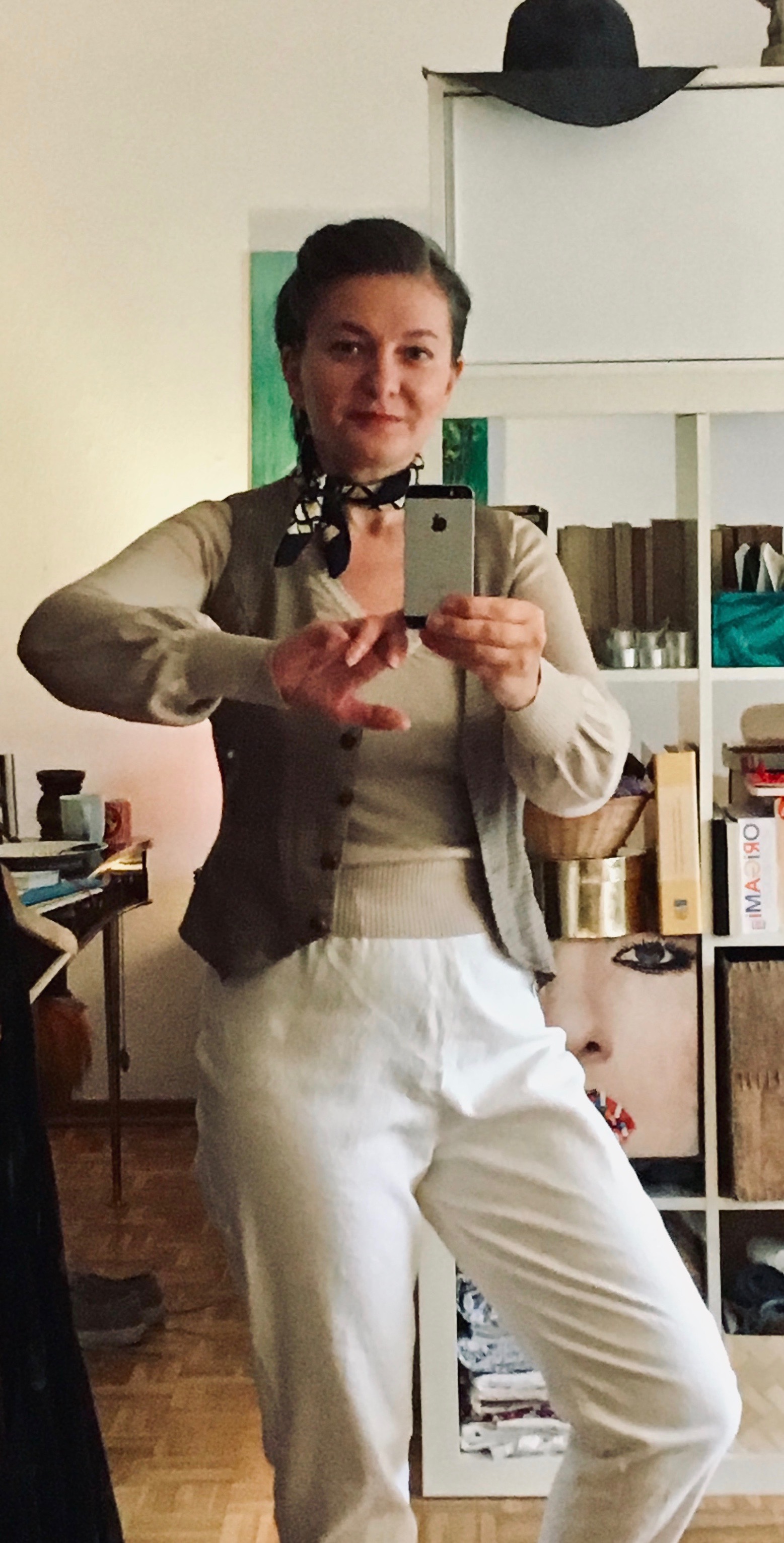 Lastly, a self portrait. Recently I decided to give up my facial anonymity. I never was really secretive about it, though. Here, you see me styled in a not fully authentic 40s outfit and hair. But it meets the purpose and I had a lot of fun sewing the trousers - actually a test piece - and making myself up with hair and make up.