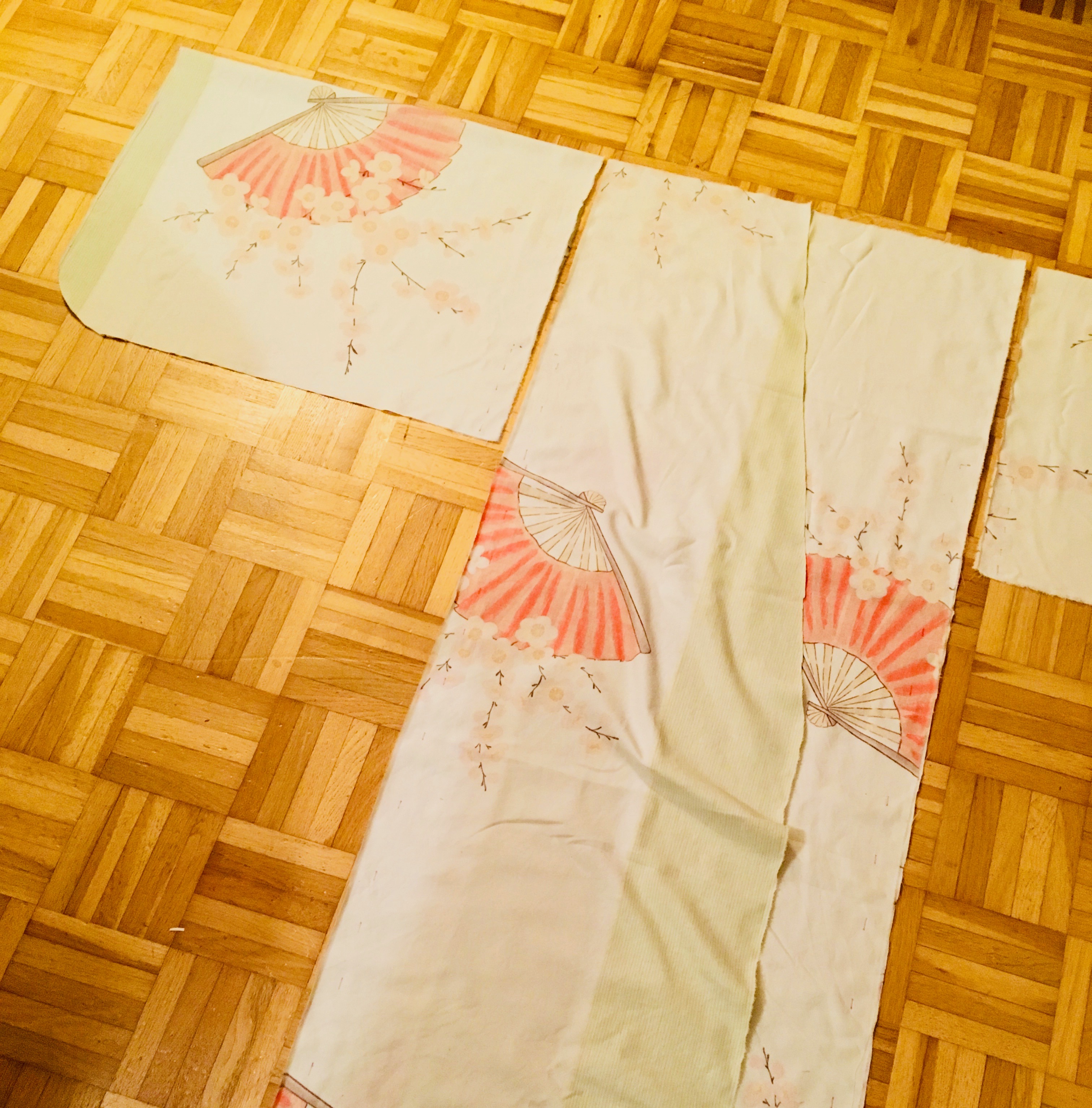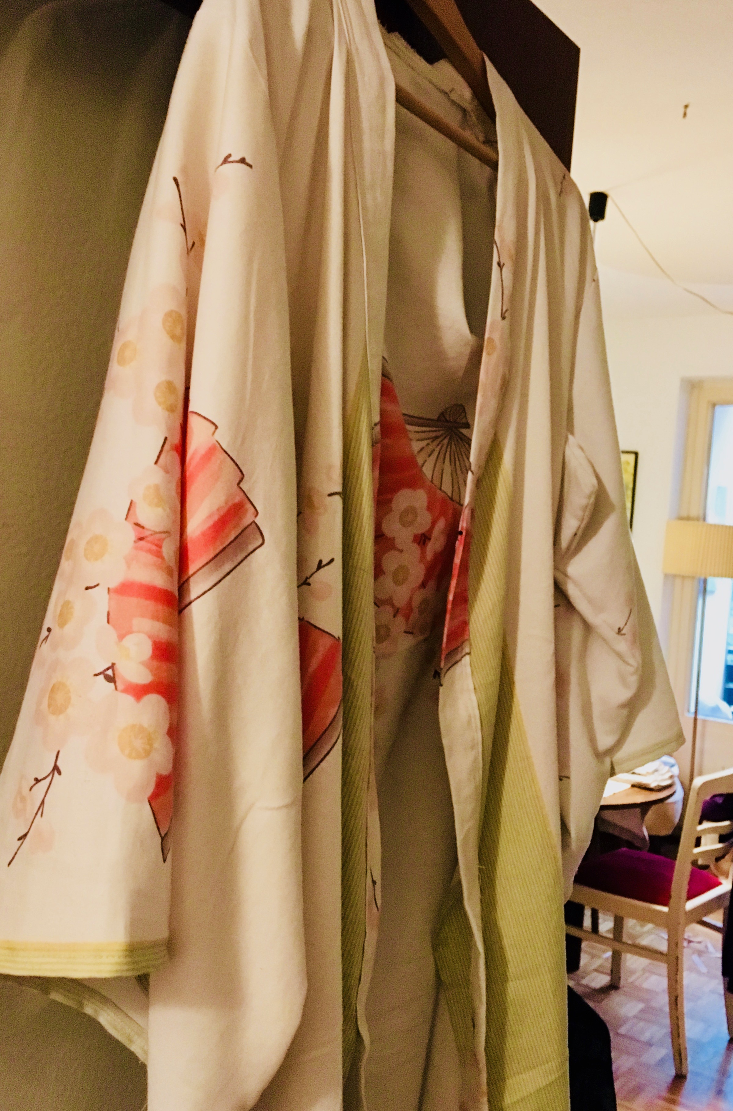 The history of this kimono here is old and new. Old, because I picked up the cloth for it as bed linen from the street or the linen was in a cardboard box, near the Johanniskirche (district church) some years ago, also where I live. I looked at it and although the zipper was defective, I took it with me. But it bothered me and since I started my new passion, sewing, I have been looking for beautiful fabrics. The motif is Asian - fans and fruit blossoms - so it fitted very well to make a kimono out of it. Here you can see the fabric victim lying dead on my floor. I am not sorry. It was reborn into a much better life.