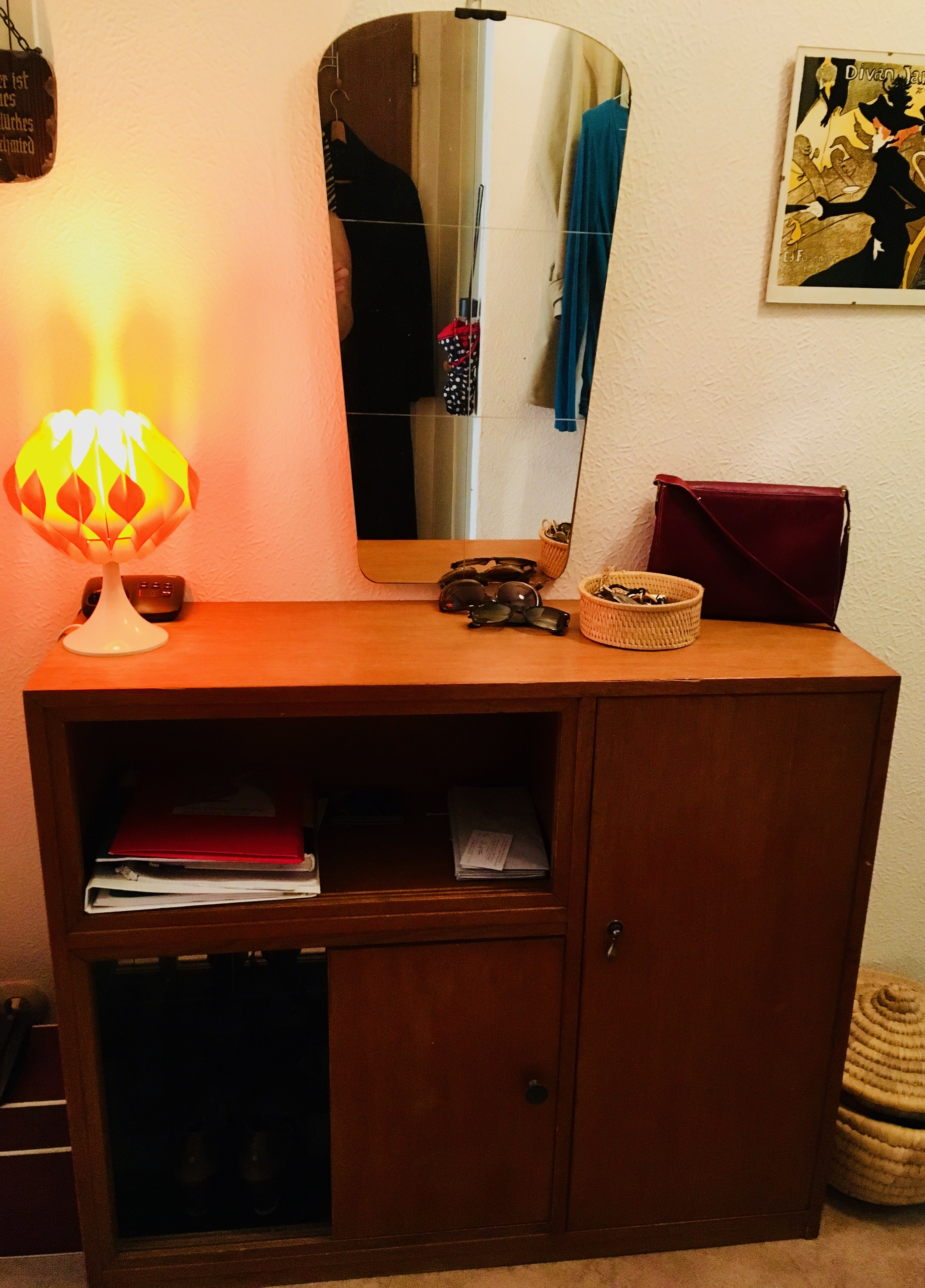 This commode is in my corridor and weighs about a ton. I don't know ... 50s, 60s? There used to be a glass pane in front of the openings, which I took out at some point (and lost on the way in several removals), as it cost me nerves because one could not move that glass panes very well.