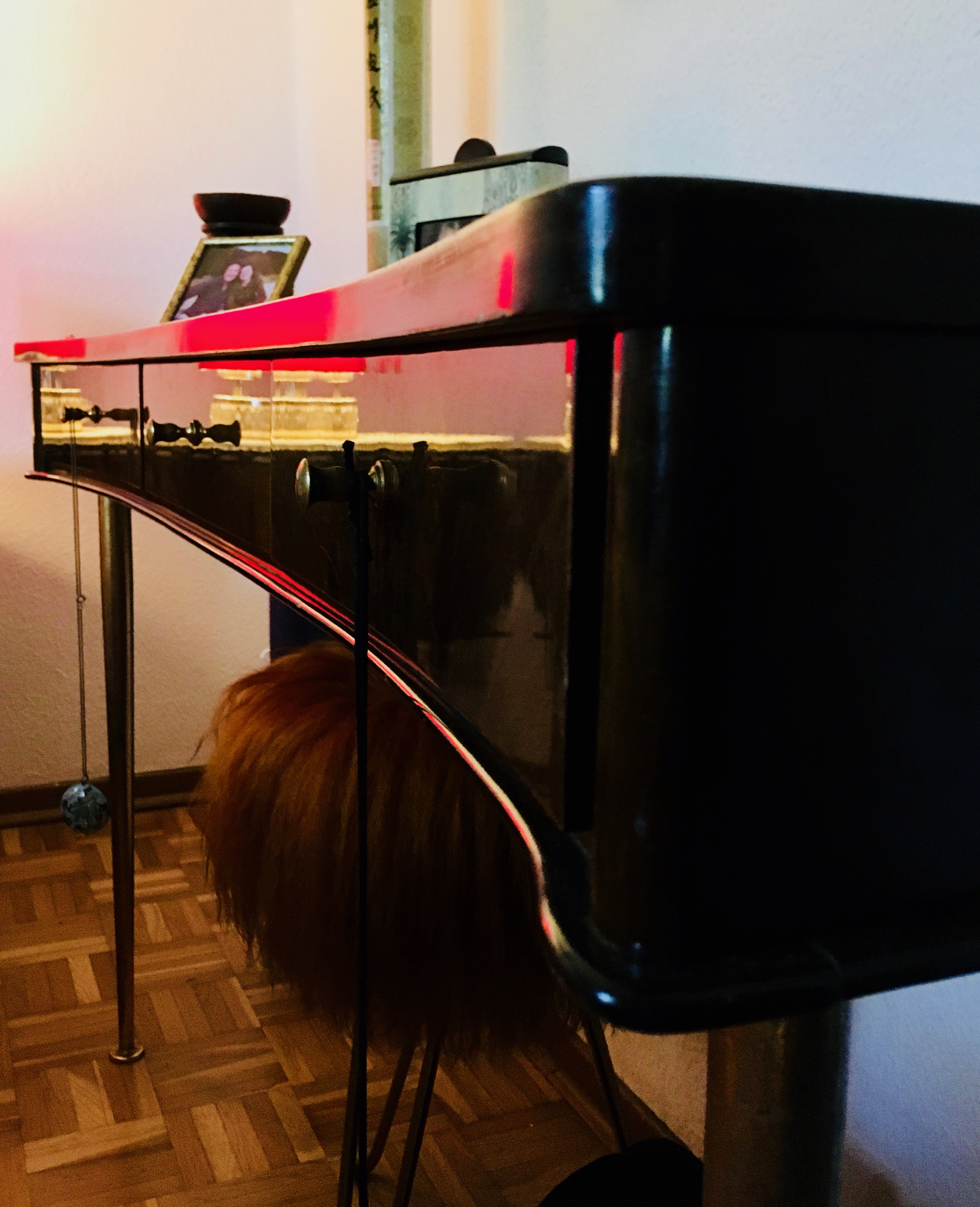Today I would leave them inside, for I have become a more patient person. So I've had that piece for a long time. I no longer know exactly where I got it from. Probably shot quite cheaply from the flea market. It has at the bottom left a completely mirrored compartment! And in the closed side it has a black glass shelf instead of a wooden one! Can you believe something like that? It is very heavy and massive. I have rarely seen such curious things in furniture. It has very impractical dimensions and is basically only suitable for beautifying and as a storage space for people who come in to the door and store keys and mail there. But for that, it is very practical!