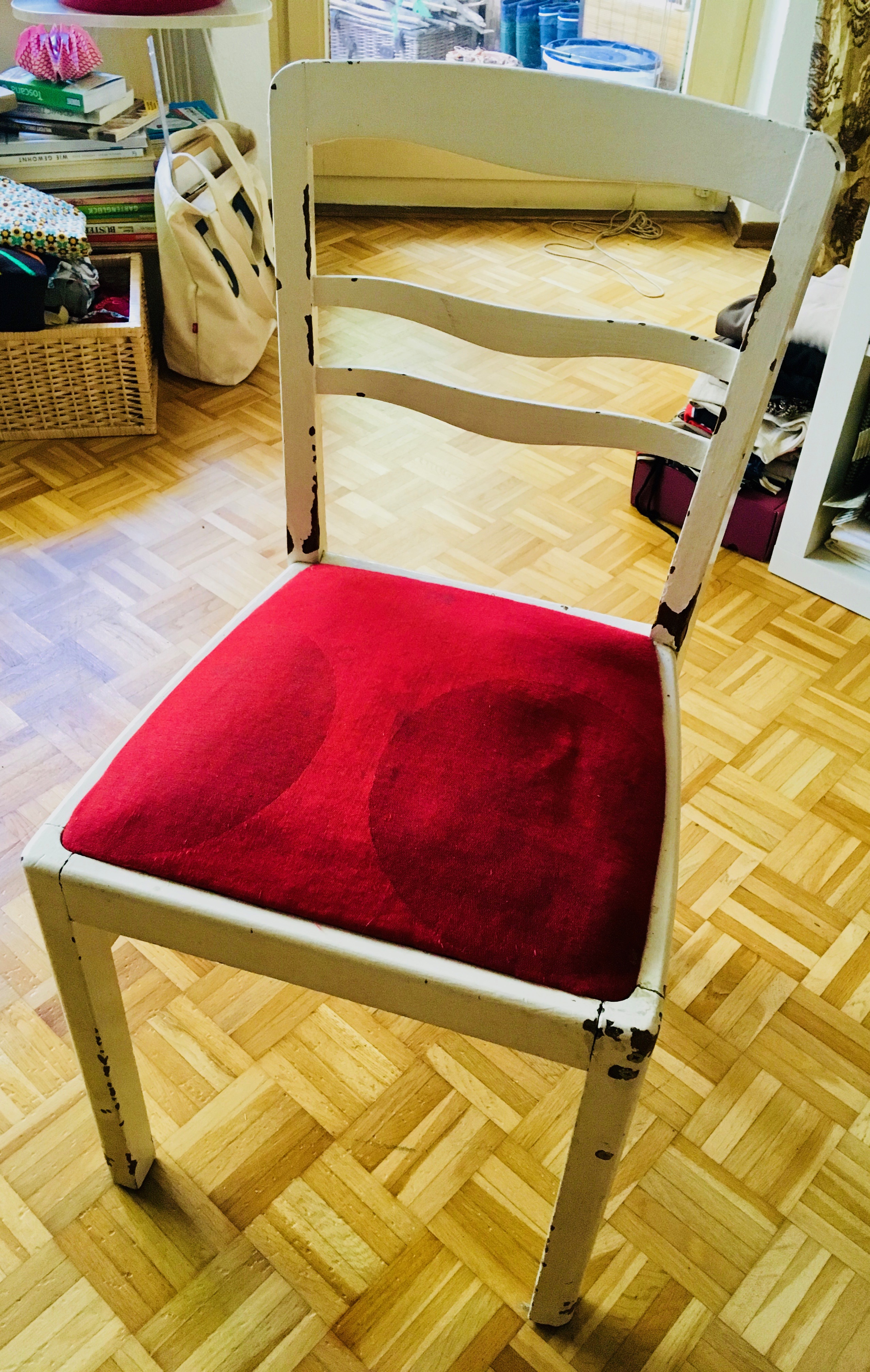Below: I picked up the chair with the red fabric upholstery from the street. It was standing on the side of the road about two years ago, not far from my home, and I carried it happily to my apartment. The flaking white color doesn't bother me at all and I leave it there. It is comfortable and I like to sit on it.