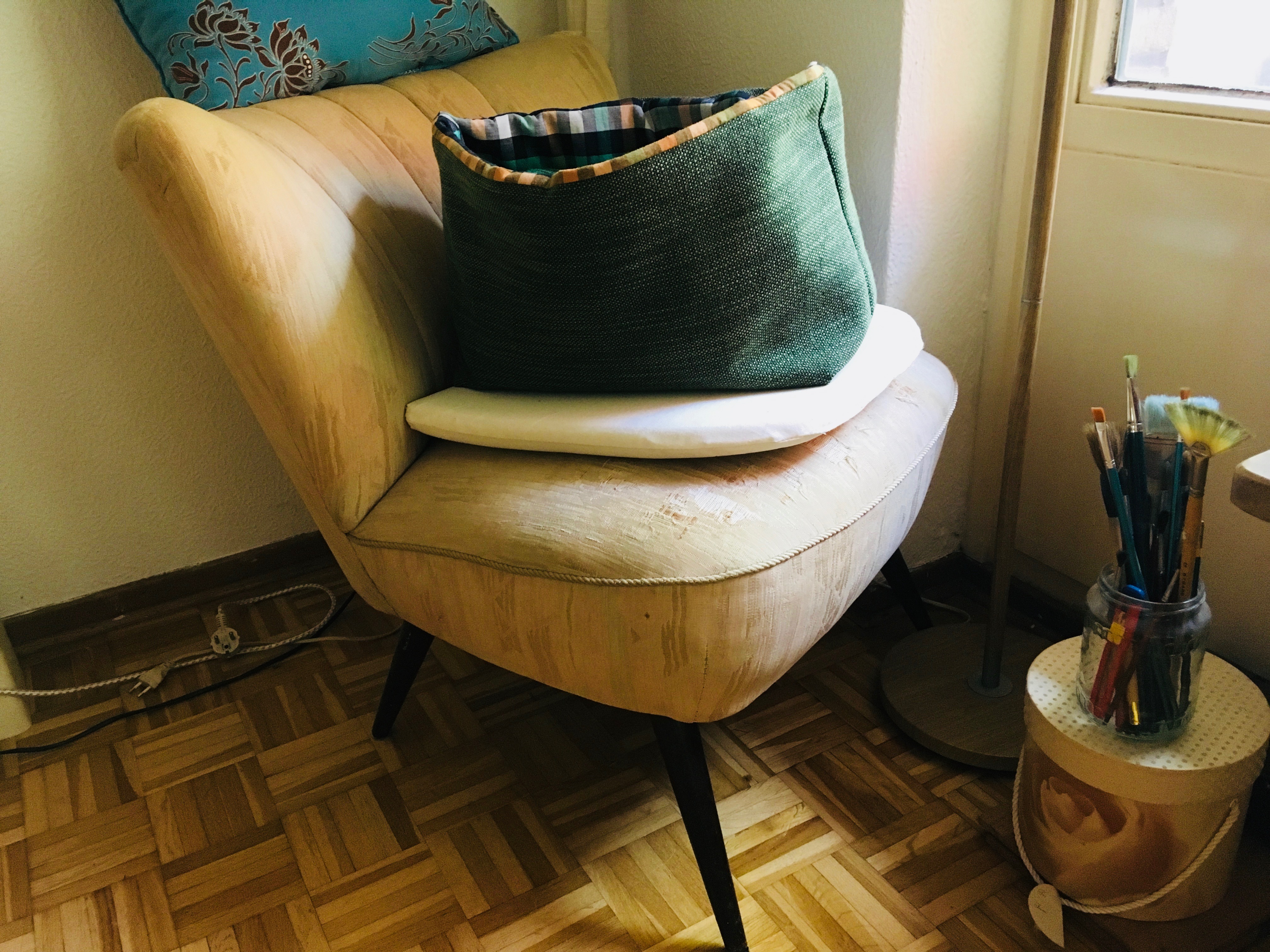 The cocktail chair I got as a couple from the sister of my first longtime friend, with whom I was together for seven years. He is a train driver and we met at a disco called "Airport". He himself was unique in terms of trends and clothing. At that time he dressed completely contrary to the usual fashion, I still remember that he wore dungarees with too short legs and turquoise shaft sneakers as well as a red close-fitting scarf. It was 1987. Listen to the hit parade from that time. Sometimes he also was in full suit and tie. Never saw anybody else wearing those clothes.