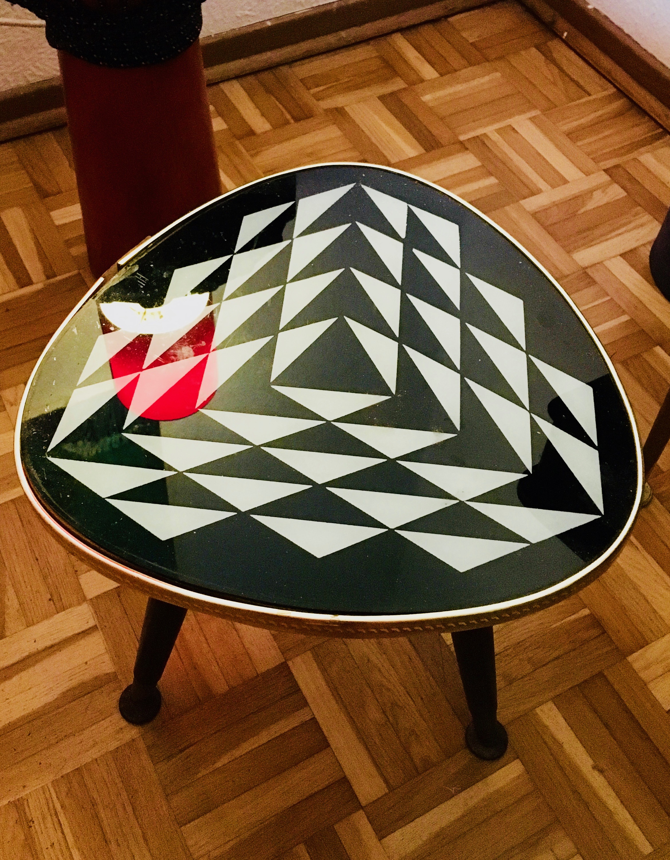 With this tripod here - I think it's a flower stool? - I really like the black and white design. It's a pretty cheap thing, not very well crafted and it's already collapsed once. I fixed it makeshift. I bought two of them as a pair, also at a flea market for too expensive a price, forgot the numbers. I think it was about 15 years ago.