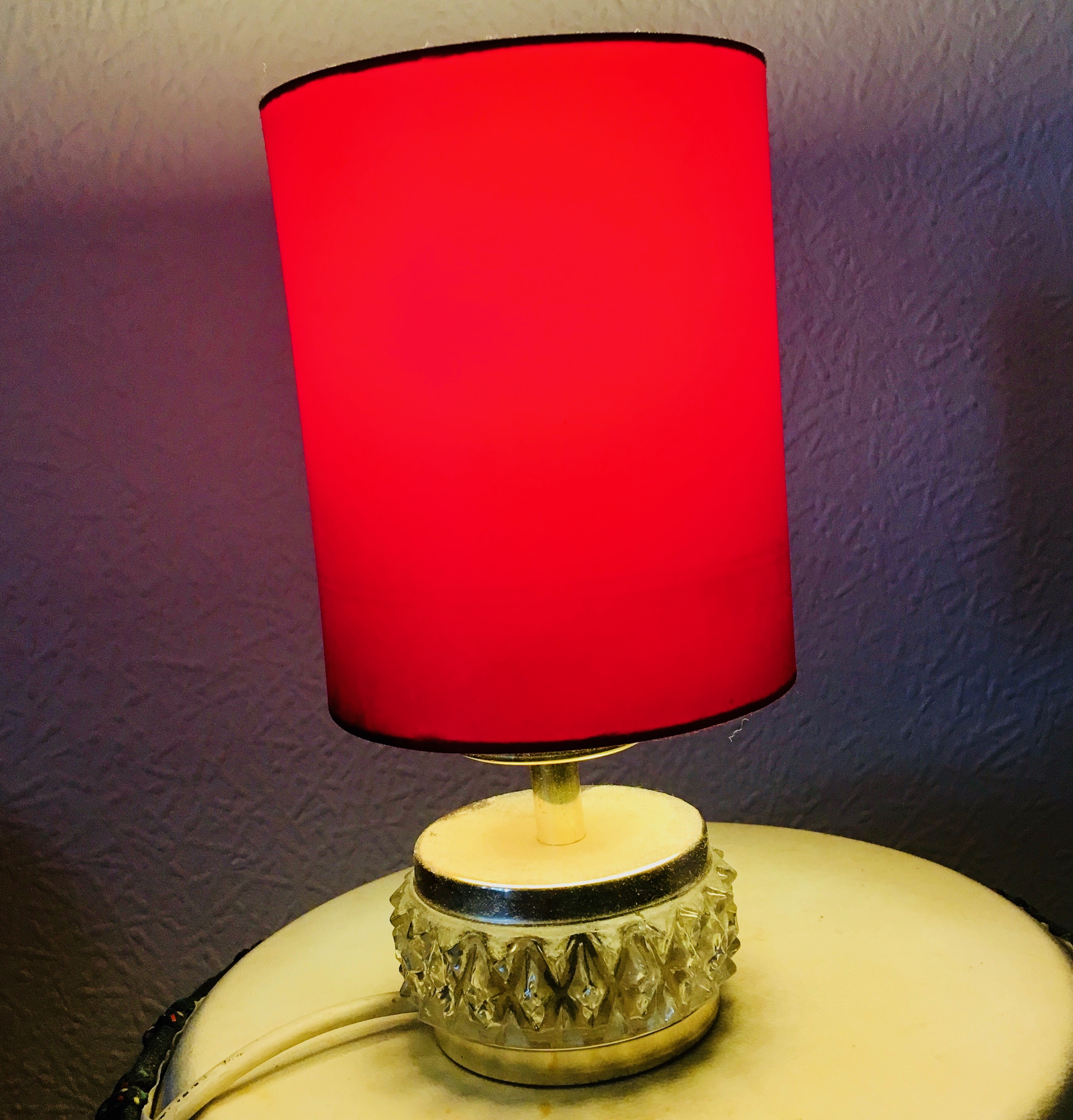 Lamp is clearly from the 70s (or late 60s), it's full plastic. The mirror above the commode is older, I guess, from the 50s?