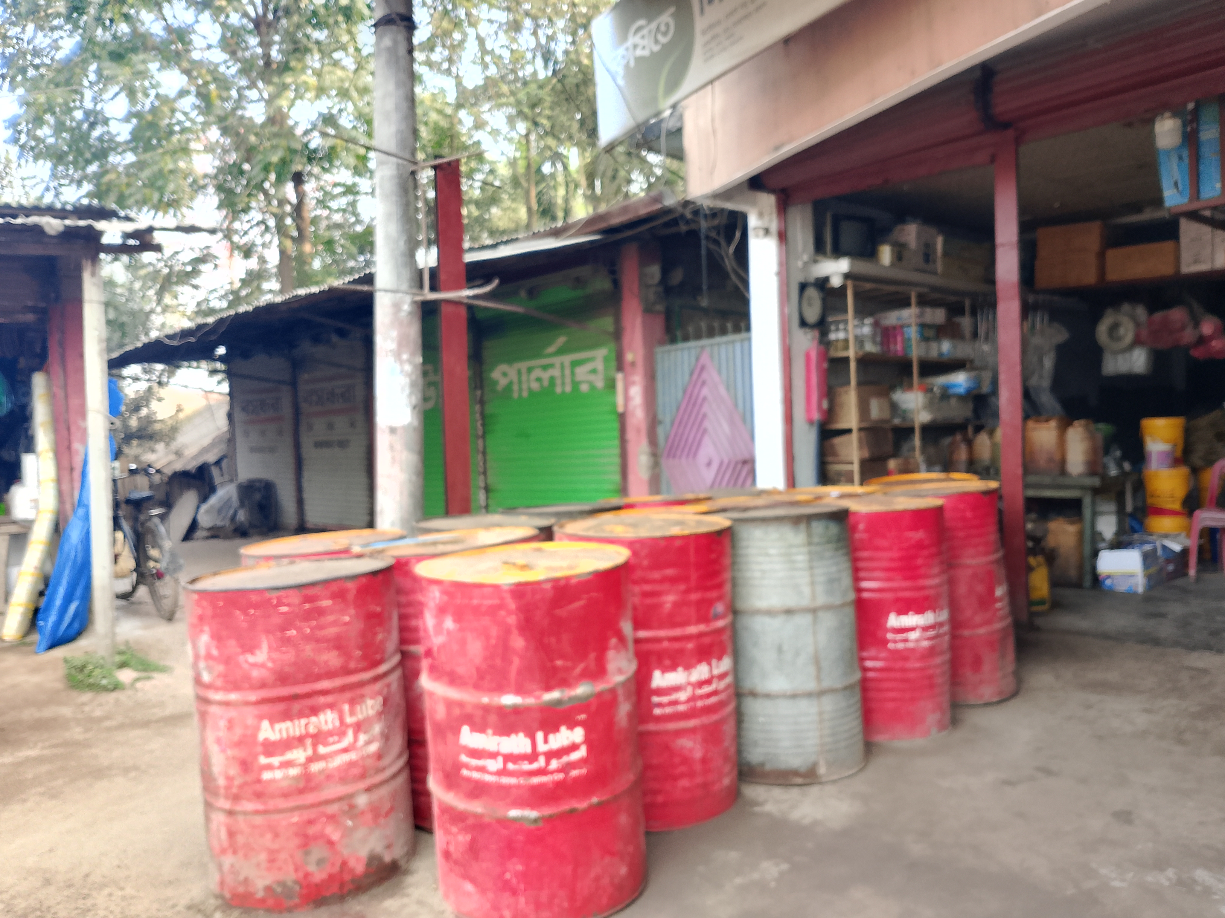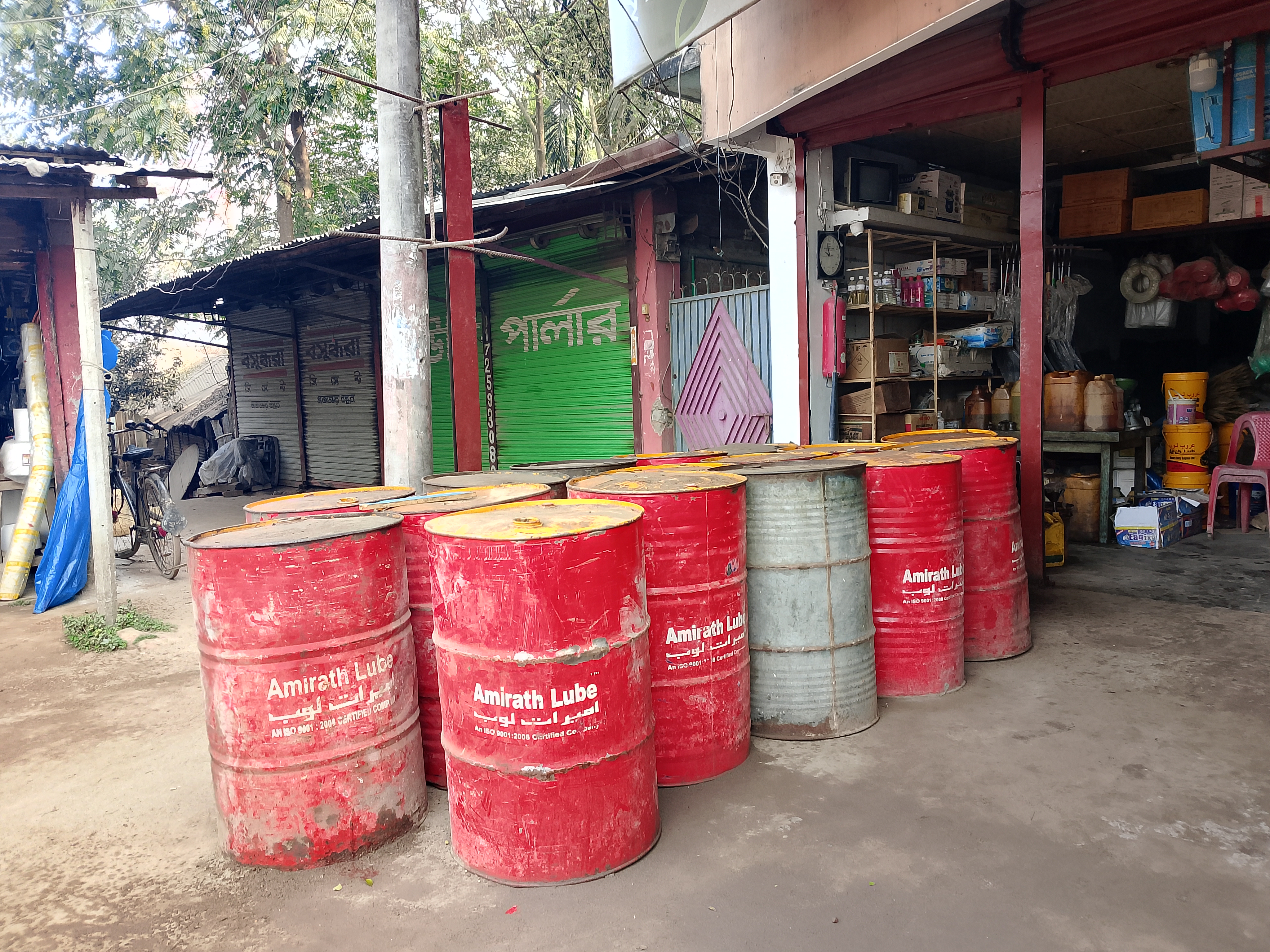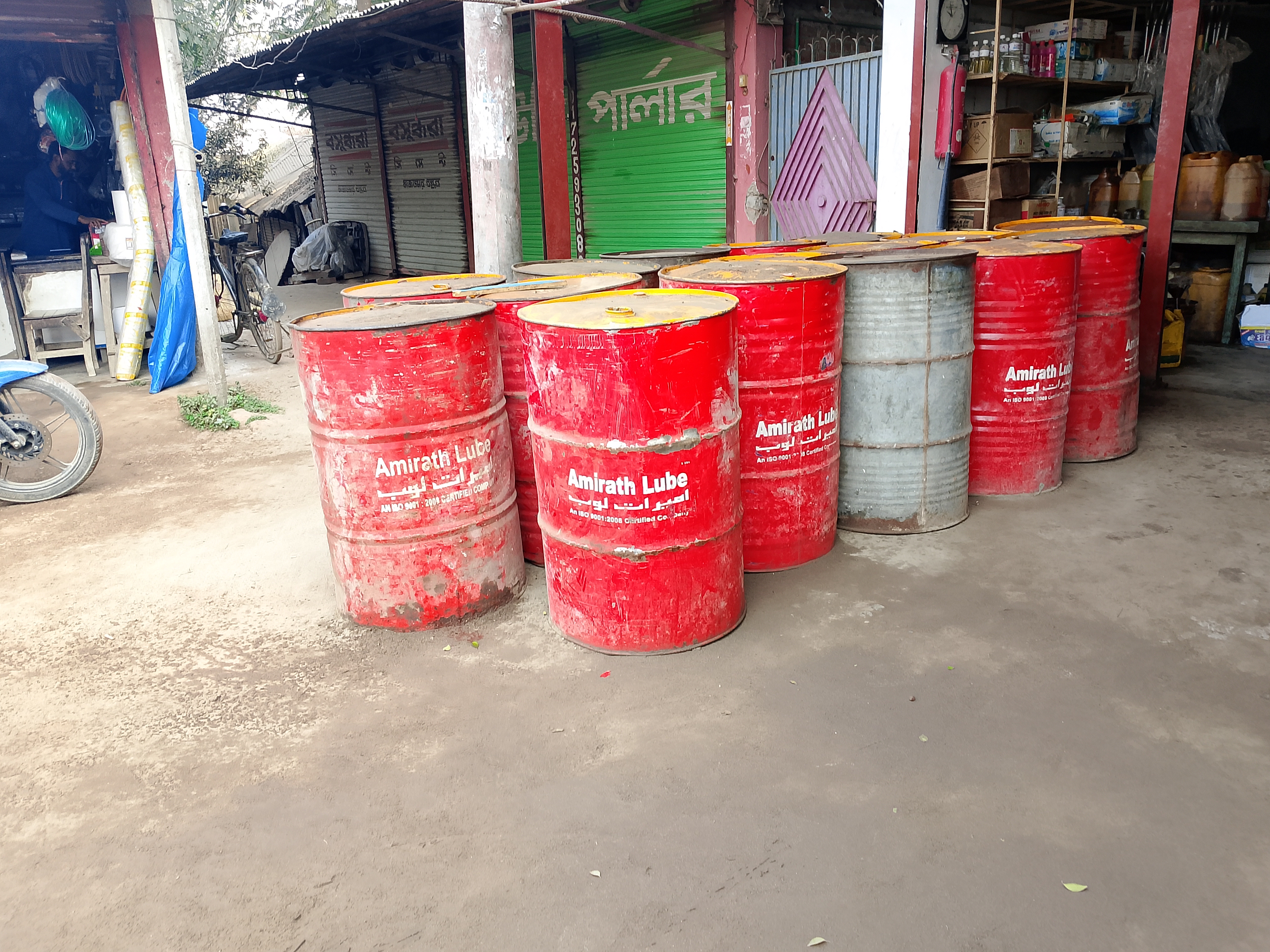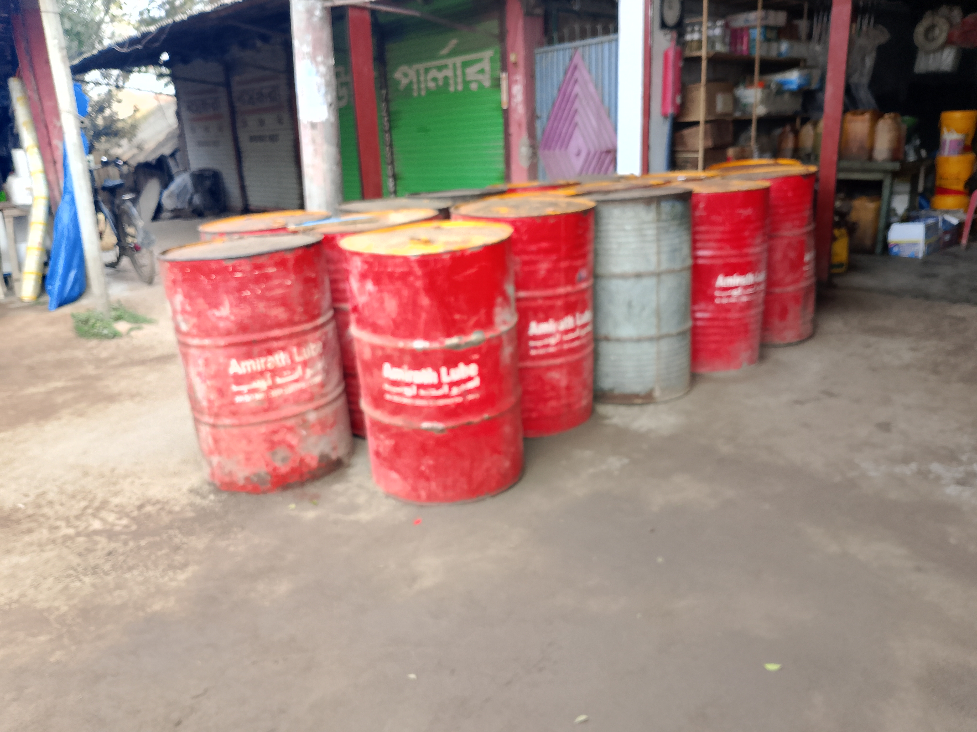 Many drums of red oil have been kept. All the oils are made of iron. They are genuine and strong, which is very useful for us. Here, in these villages, we can bring oil and various other things. In front of a shop, many of these have been listed in large quantities.