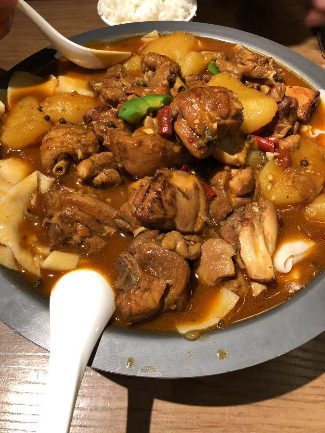 The big plate chicken is made of chicken and potatoes. It is super delicious and it is really delicious with rice.