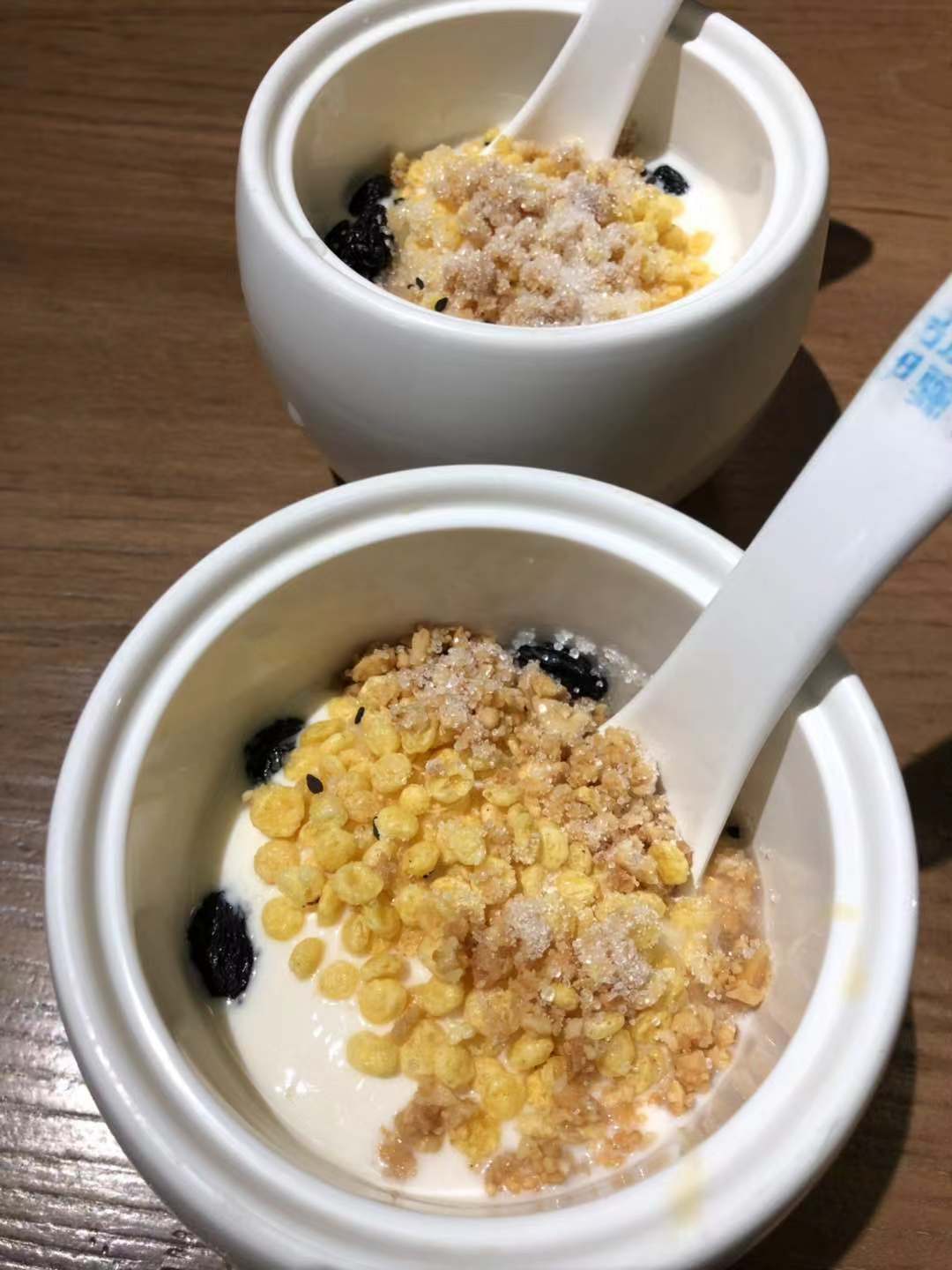 Yogurt is made by yourself. It is filled with sugar, oatmeal and raisins. The stuffing in the baked buns is onion and mutton. It is baked and tender, very delicious.