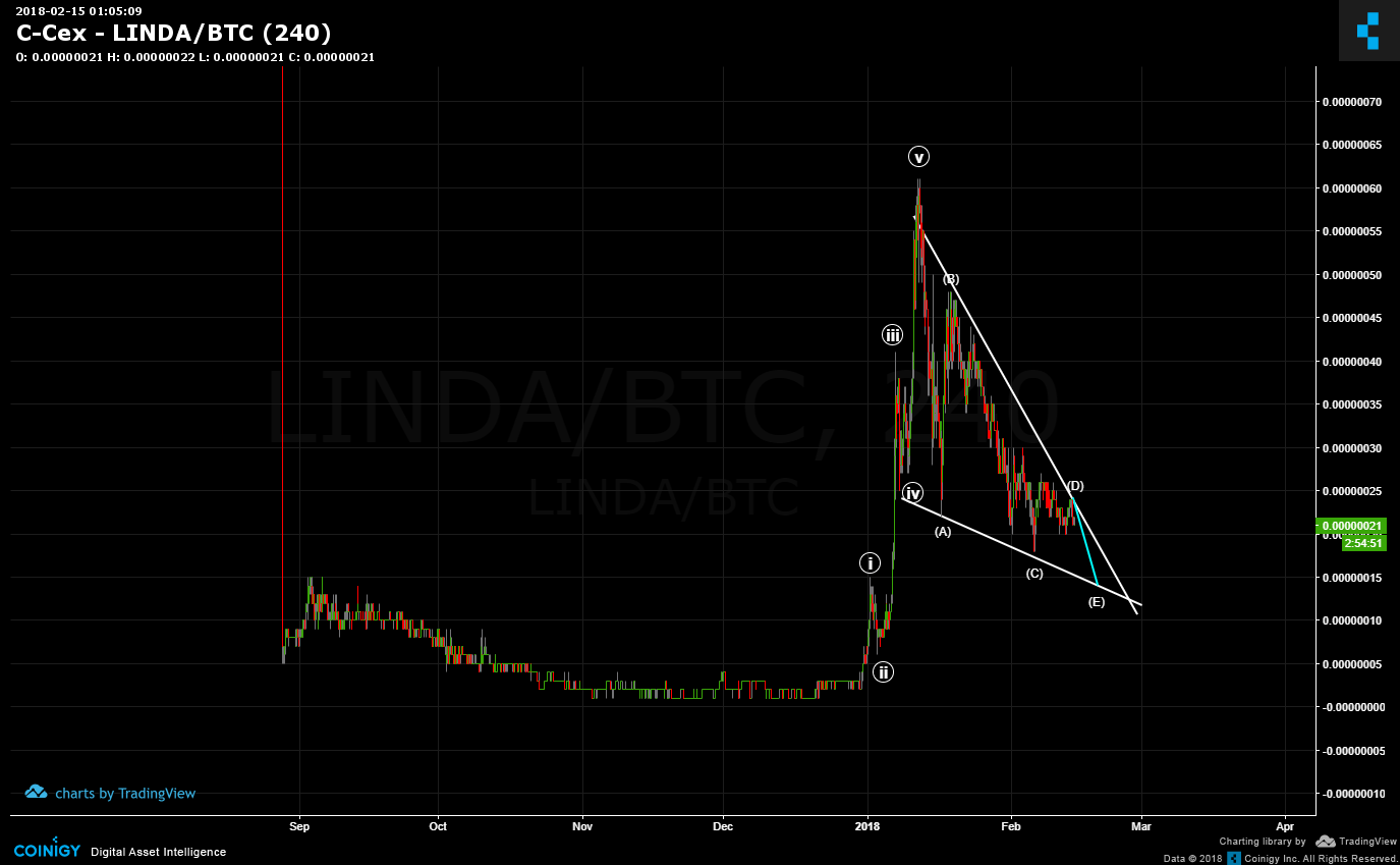 The micro-Elliott Wave count of LINDA shows an impulse where wave 3 can allow price to escape the boundaries of the triangle. Clearly, should the bullish sentiment catch on, wave 3 and 5 heights can be extended.