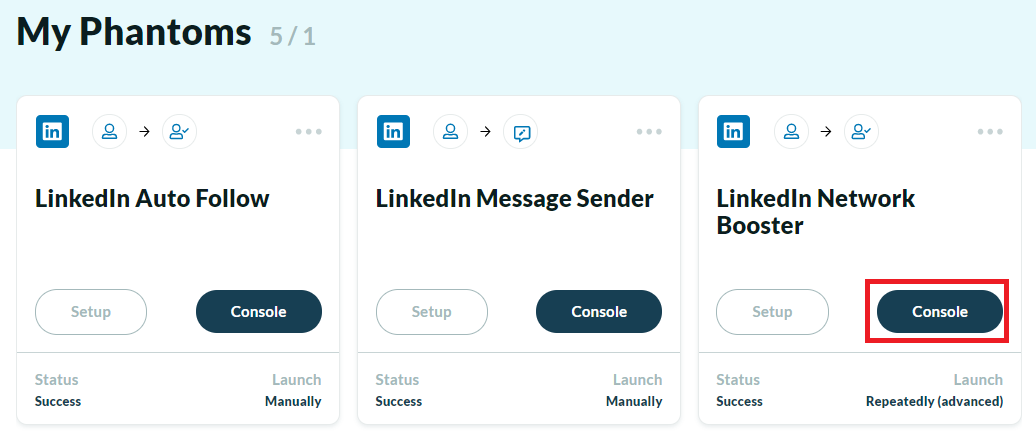 Once the network booster phantom, will have run once; you will be able to copy the result file to link this buster. To do so click on on the “Console” button under your phantom name: