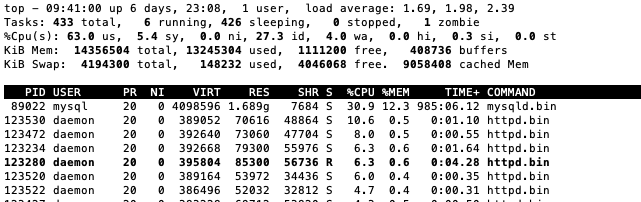 mysqld.binprocess is constantly taking up > 150% CPU, and - Available memory is constantly low, with about 90,000 KiB Mem left.