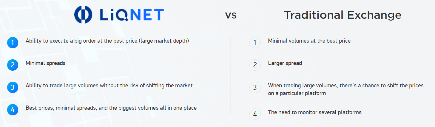 LIQNET is a cryptocurrency exchange that aggregates liquidity from a number of different exchanges over the internet. The goal is to reduce the bid/ask spread while proposing users the highest liquidity across multiple order types and markets.