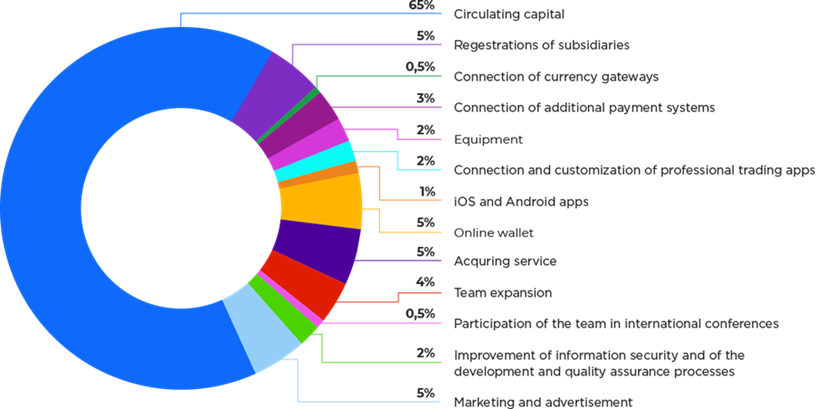 If 40% – 90% of the Hard cap is collected — the share of the circulating capital will be proportionally decreased from 65% to 50%, and the share of the other RM items will be proportionally increased.