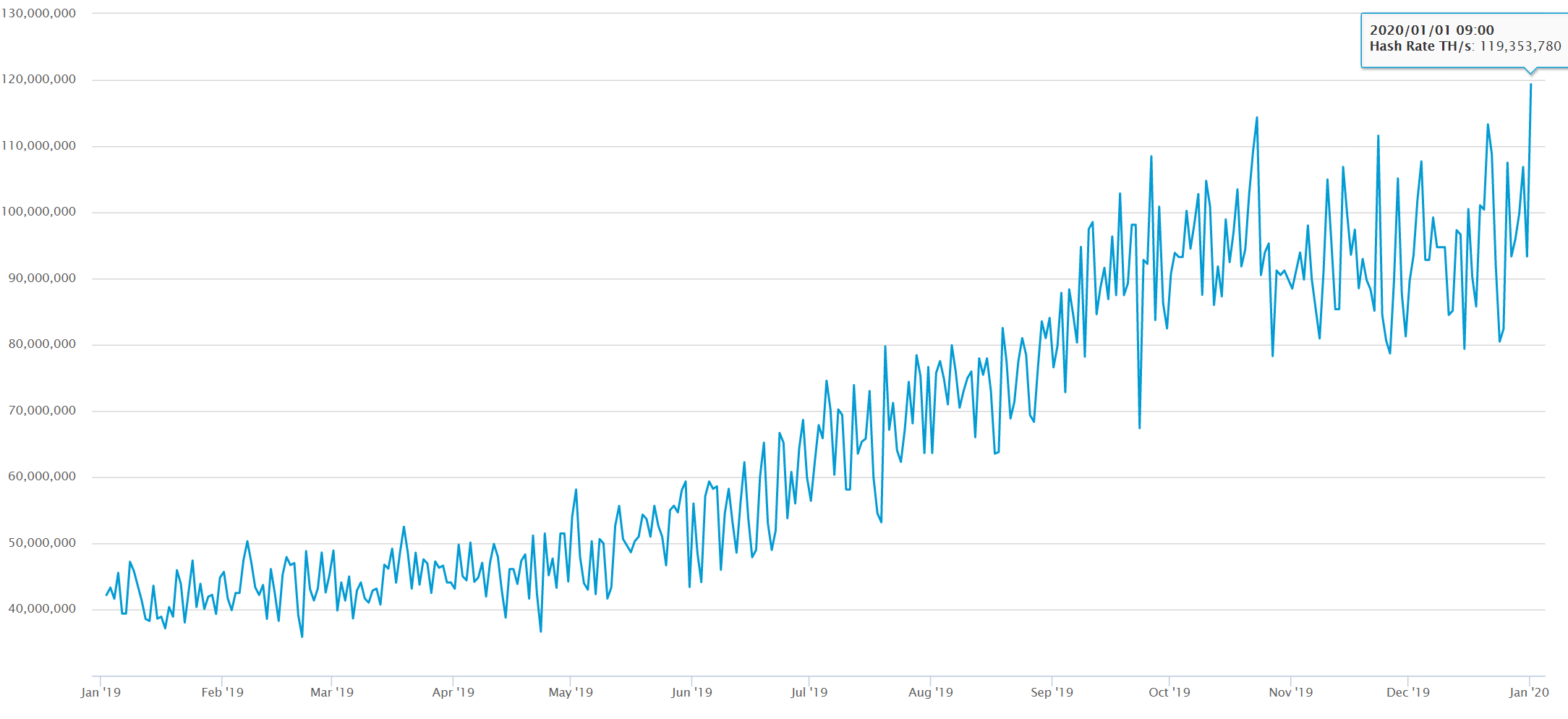 또한 blockchain.info에 따르면 해시레이트는 역시 119 TH/s로 사상 최고치를 기록했습니다.