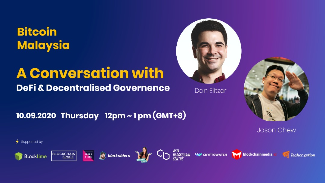 Decentralised Governance w Dan Elitzer | DeFi Education for Southeast AsiaDate: 10 Sep 2020 ThursdayTime: 12pm - 1pm (GMT+8)Dan Elitzer is special. In 2019, Dan wrote 'Superfluid Collateral', which accurately predicted what we're seeing today in DeFi ... 18 months before it happened. Thus, I'm very happy to invite Dan for a chat with us this Thursday. Tune in our FB livestream Thursday @ 12pm (GMT+8) so that you can e-meet Dan and ask your burning questions.Mark your calendars and tune in here: https://www.facebook.com/groups/BitcoinMalaysia/permalink/3594183473949477/