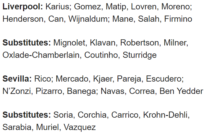 Only four of those starters are starting today: Lovren, Moreno, Can, and Firmino. On the opposing side, Sevilla have three survivors from their victory: Escudero, N'Zonzi, and Banega. Unai Emery has also since left them to join the riches of PSG, with Eduardo Berizzo now taking the reigns. The personnel turnover makes this an intriguing game as the two sides are hardly recognizable from their last meeting.