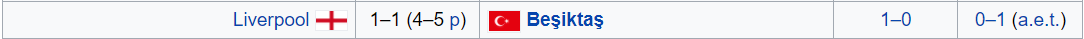 That season, Liverpool crashed out of the Europa League by losing 4-5 on PKs after a 1-1 aggregate with Besiktas of Turkey.