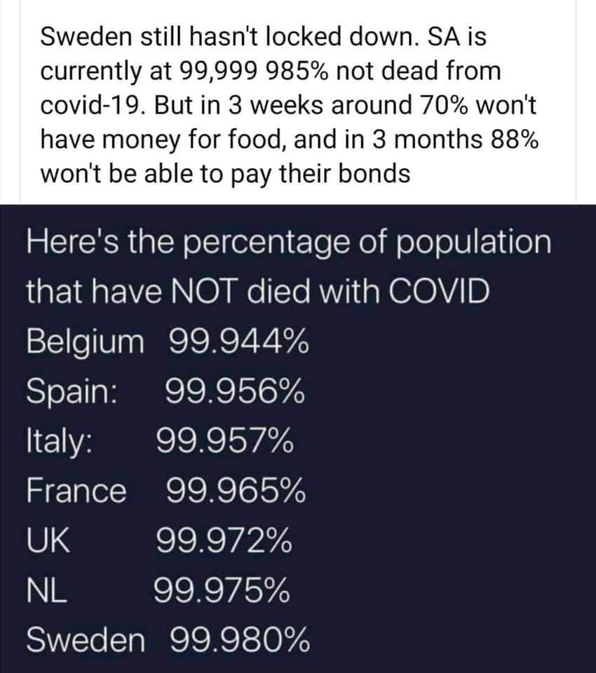 We don't know with 100% certainty that the lockdown was the best course of action and the global scientific community are split on this question as well. But we need to evaluate where we are now two months into this outbreak, the highest affected area is the USA, with an 0.2% infection rate and a death rate 0.02%. South Africa has an infection rate of 0.01% and a death rate of 0.0002%, and the question is does that constitute bankrupting the entire country? Unfortunately we have to compare this to other pandemics where government has taken almost no action. South Africa has 58 murders a day, 154 rapes every day, 38 road deaths each and every day, and what extreme measures did government take? Absolutely fuck all. Just an example, if our government really valued human life they would reduce the speed limit to 20km per hour, and it would eliminate road deaths saving 38 lives everyday. You have better chance of being raped twice and then murdered while dying in a car accident, before you die from the Corona virus, and you risk that everyday.