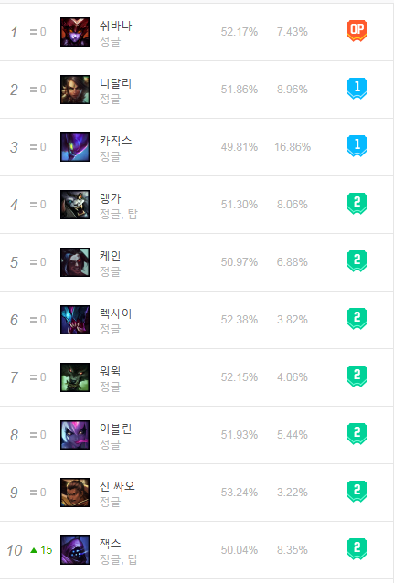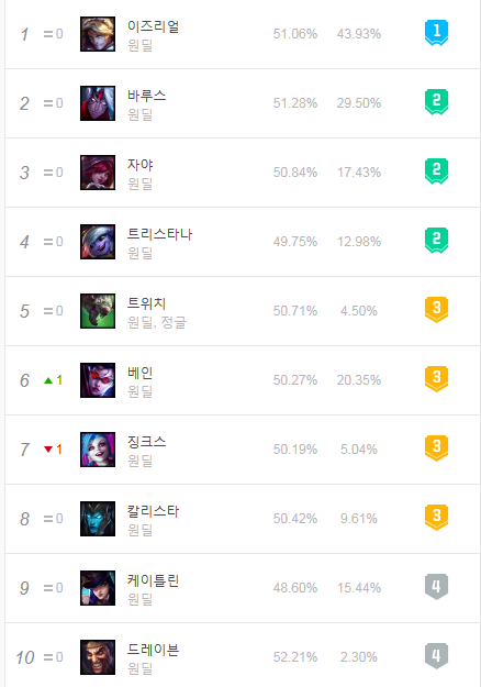 롤 라인별 OP챔프 목록 (ver8.3, 2/16일 기준)rubben (25)in #lol • 8 years ago 라인별 OP챔프 목록입니다. 보통 픽률 10%상회하면서 승률51%이상이면 대세챔프라고 봐도 무방하죠. TOP JUNGLE MID BOT AD BOT SUP (사진출처: op.gg) #leagueoflegend #champion #faker #lck