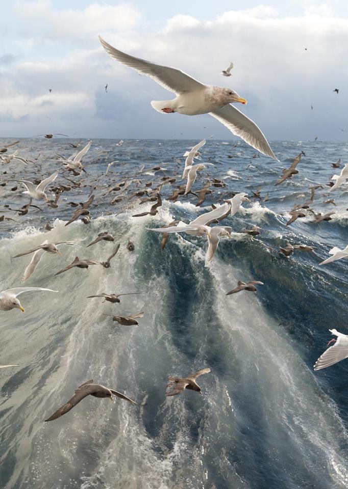 "Seabirds thrive off the discarded fish scraps of a catcher/processor in the Bering Sea somewhere near Adak Island."