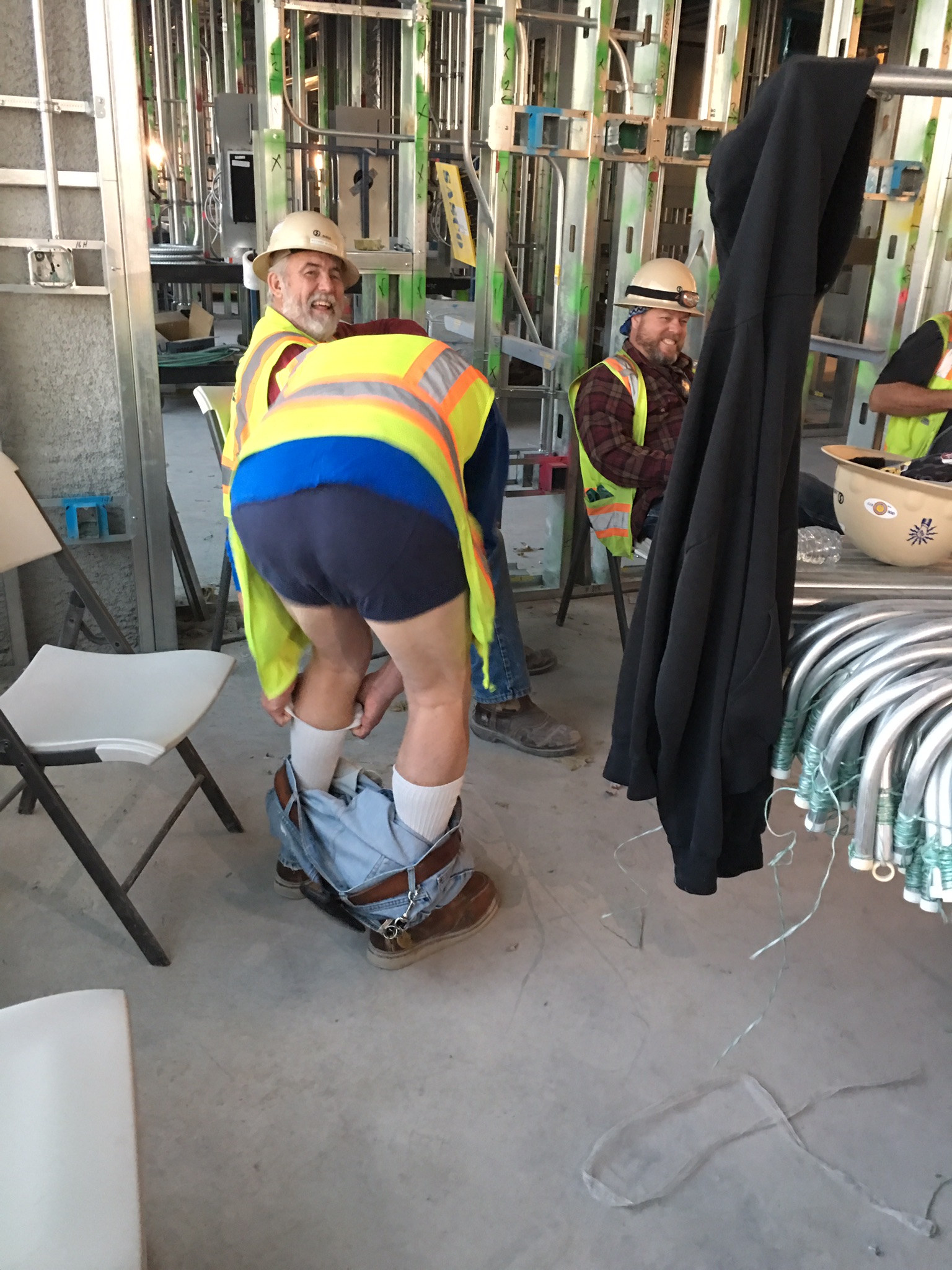 While on his feet and in front of the entire crew, supervision included, after interrupting the foreman’s safety meeting, Jimbo unbuckled his belt and dropped his pants to his ankles. He reached down and pulled up his socks, one at a time, before finally pulling his pants back up. He buckled his belt and sat back down in his chair as though what he just did was perfectly normal behavior. “You were saying, boss-man?” Jimbo asked the foreman. Of course, we all got a real good laugh out of it, we couldn’t stop laughing actually, and the foreman continued on with his safety meeting while shaking his head in disbelief.
