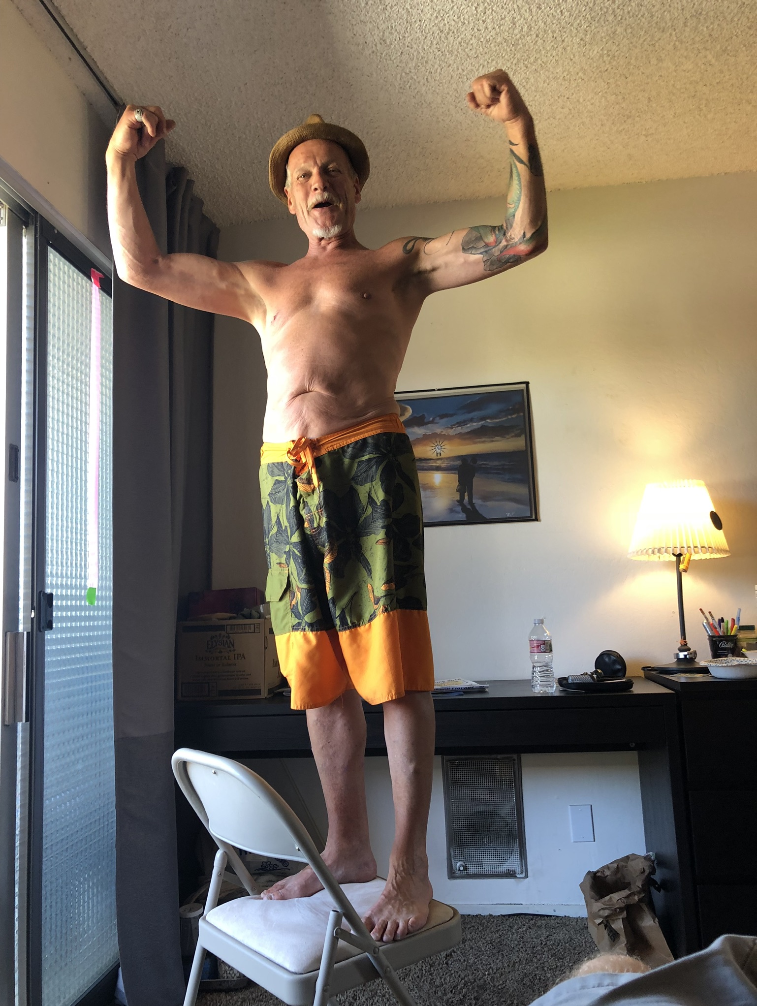 See that bottle of water on the desk behind him in the above image? He hadn’t started drinking beers yet, it’s still early at the time of this photo, most people have an intoxicated excuse for climbing onto an unstable folding chair and start flexing their muscles first thing in the morning—not Jimbo. That’s just his way of letting you know he’s awake. I looked for a picture of his mohawk just now, it seems I don’t have one in my phone, you’ll have to take my word for it. I have this one, though, you can imagine what his mohawk looks like with some gel in it, spiked and dyed orange.