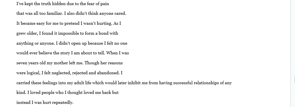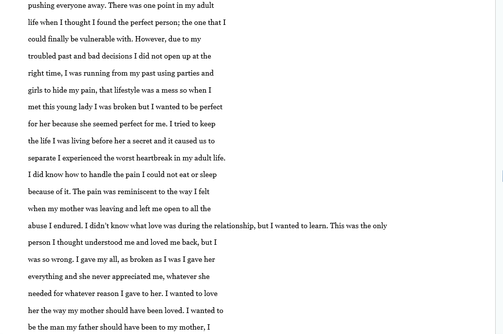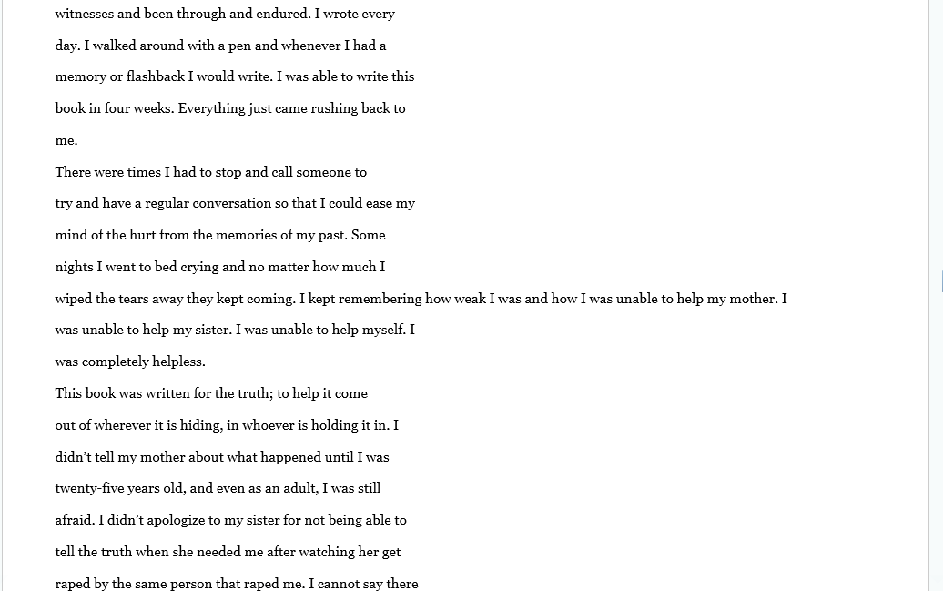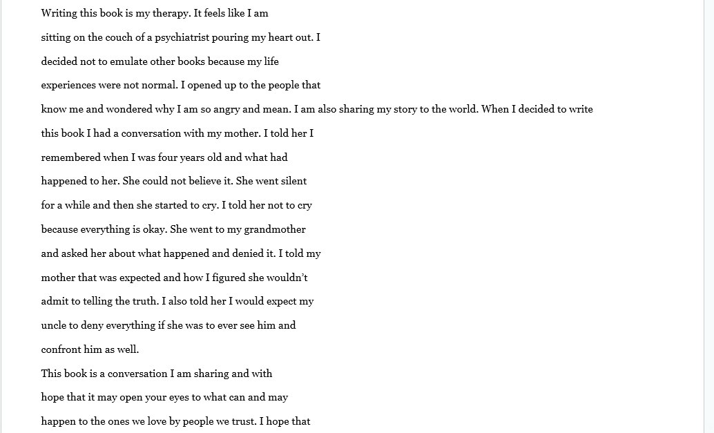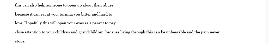 There is not to much to say that has not already been said. A lot of people go though life with a lot bottled up inside, mainly because their ashamed of their past. Joseph was very transparent in this book and I appreciate him sharing his story and allowing God to use him. Sometimes what we go through is actually meant to help someone else. God picks his strongest men. And Joseph is a true angel.please read or buy for someone who is or has battled with any type of abuse this could be the break through they need. Well done Joseph.