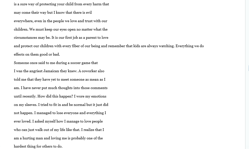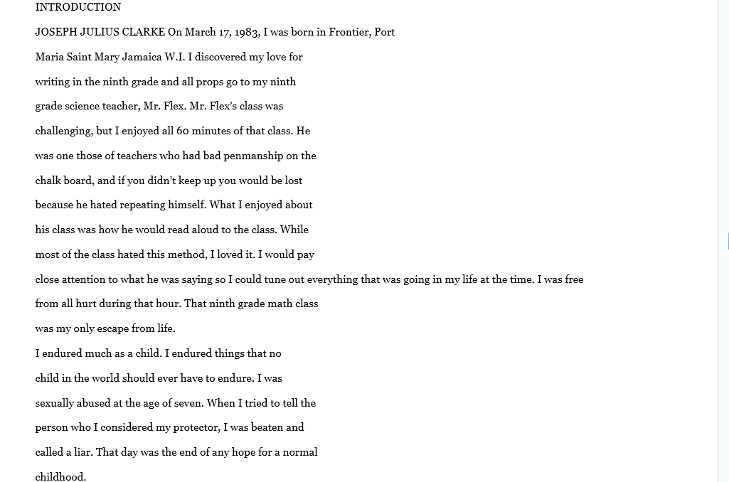 WOW... I read it cover to cover and felt so many emotions. There are so many young men who stay silent and for Mr. Clarke to share his past in such rawness makes this a necessary read. No child should go through life wondering what love feels or truly looks like. He paints such a vivid description of his living conditions, the mental, physical and sexual abuse and his search for love that I found myself crying. I wanted to reach out and save him though the pages. There were some minor errors and editing issues with formatting it on my Kindle, but I still found it to be a good read. If you want to know how damaged children think and feel you should read his story. If you want to read how children of abuse can grow to be adults that want and strive for better for their own children, you should read his story. I notice this is a part 1 and I look forward to part 2. There is a lot of regrets in this book, however I truly hope by sharing his story other young children will know to keep telling and keep fighting until someone listens.. #NoLove gets #LotsofLoveFromMe
