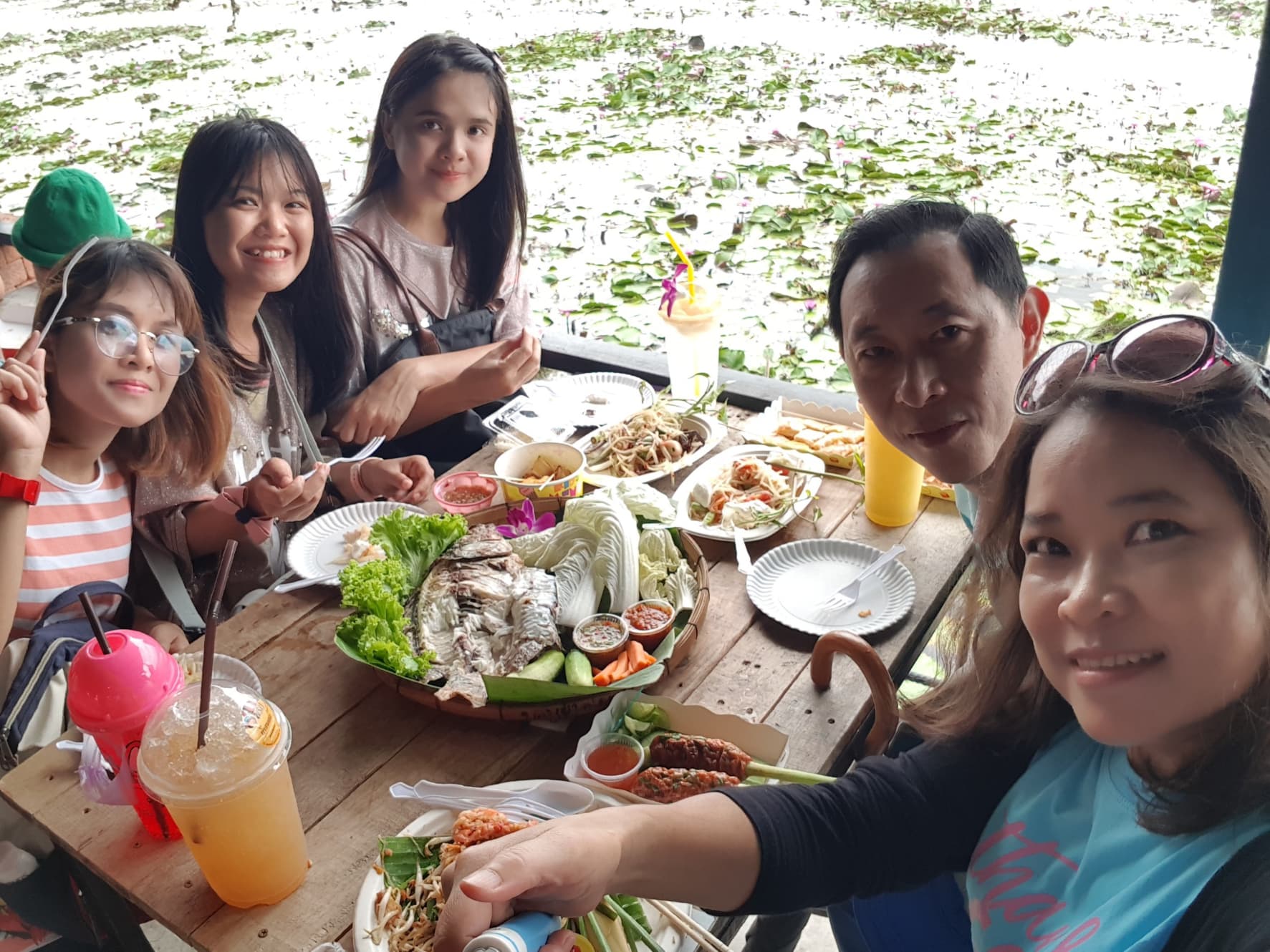 After I ate Sushi, I spend the time for a while. Then, my aunt picked me up and we had dinner together. The activities on that day ended. In the next morning, we had to wake up early. After we dressed already, it was time to go to the amazing place. There was the red lotus floating market. There was far from Bangkok about 57 kilometers. This place was so beautiful and terrific. The first time I saw there Oh my god! I got the very very fresh air. I believe this feeling never found in the capital city in Thailand. Because of Bangkok was so chaotic. The scenery of here full of the tree, the river and the red lotus.