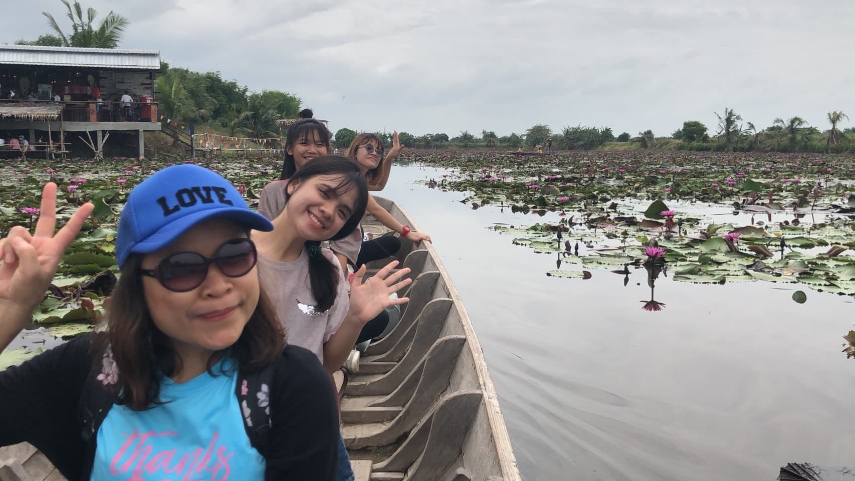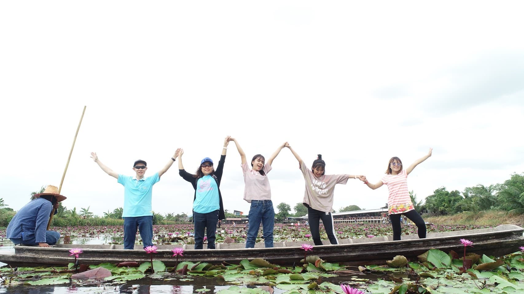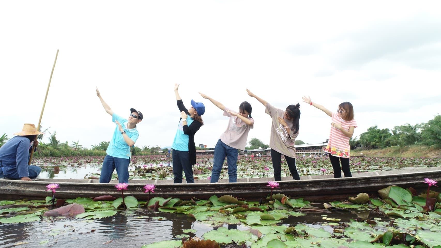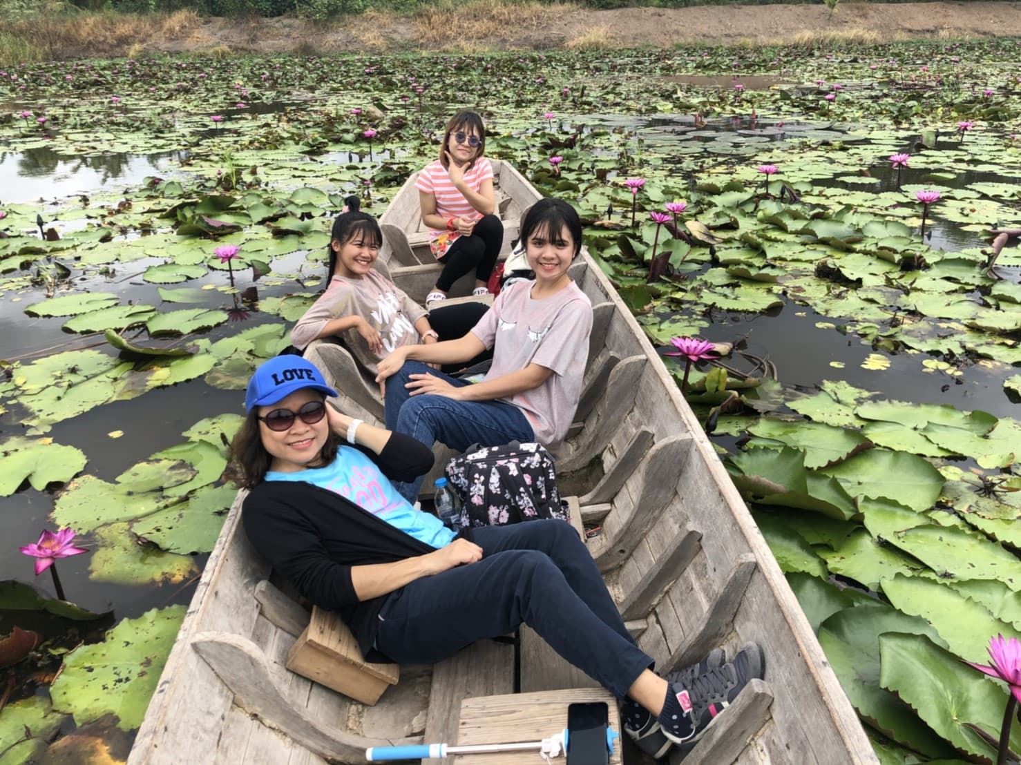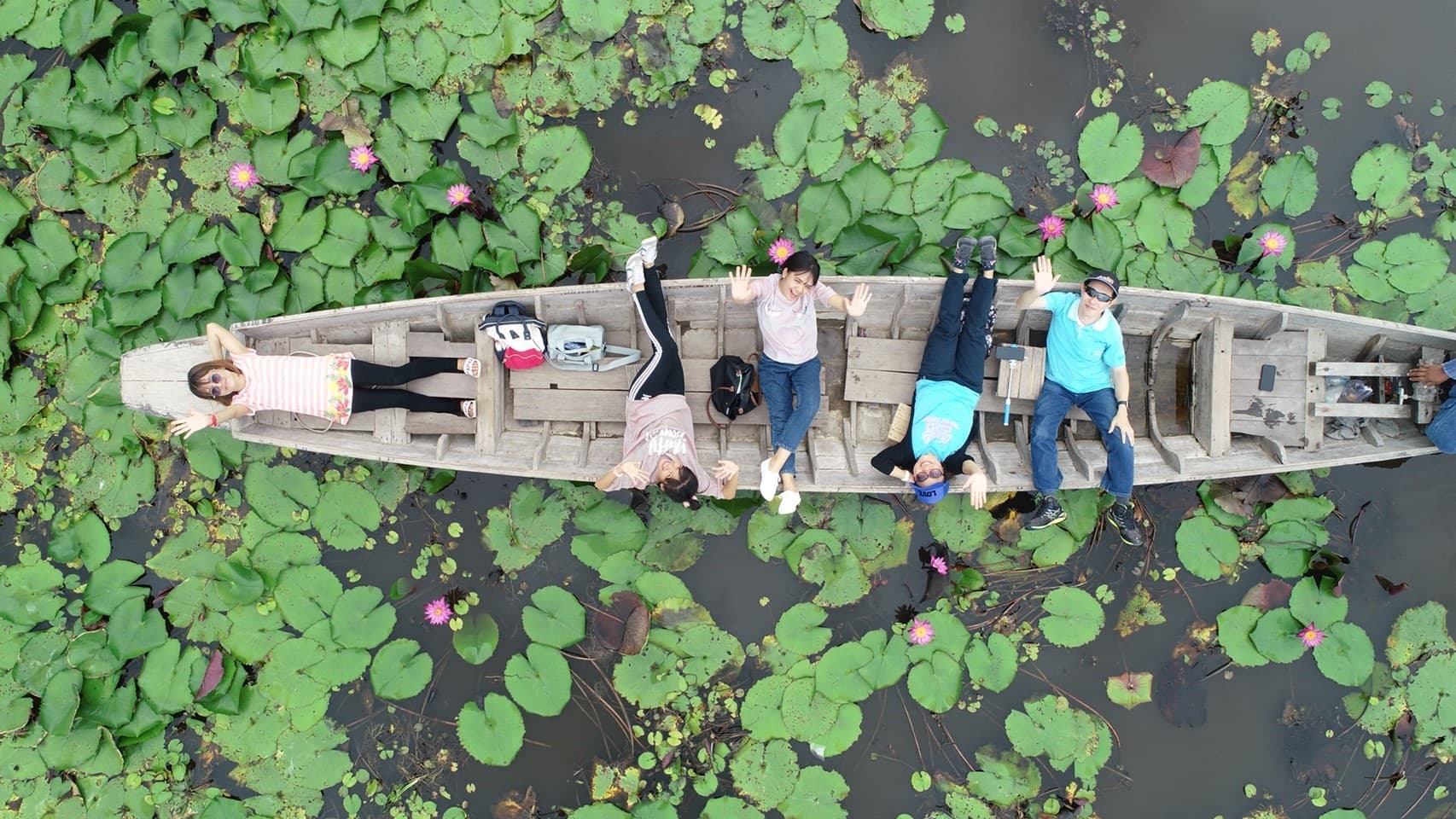 After lunch time, we were interested in sitting on the canoe and seeing the red lotus. The canoe owner gave us the promotion. That was paying 400 baht for tooking camera by the drone. We were excited very much because we had to balance on the canoe. We smiled. We laughed. This was a very good time.