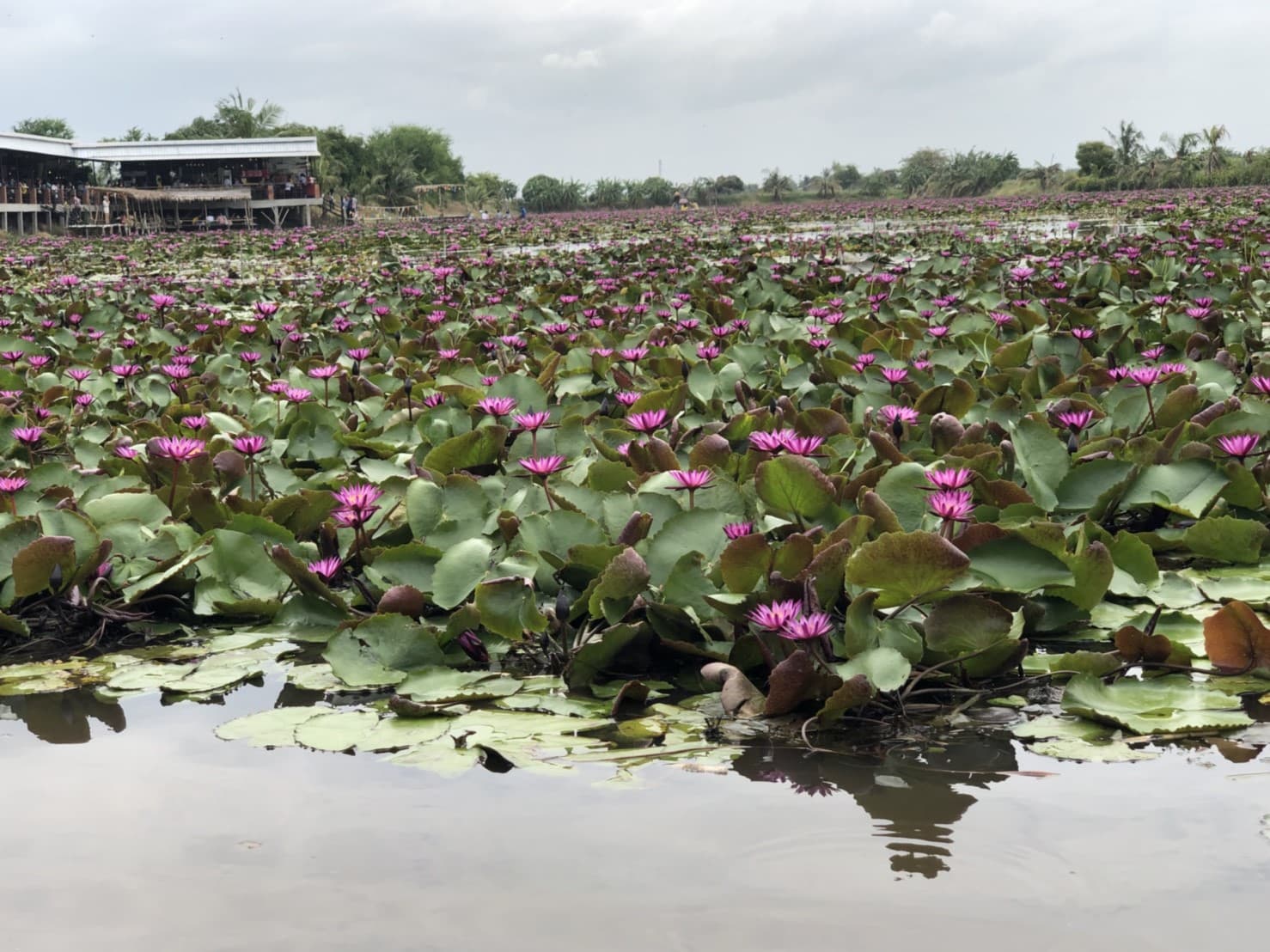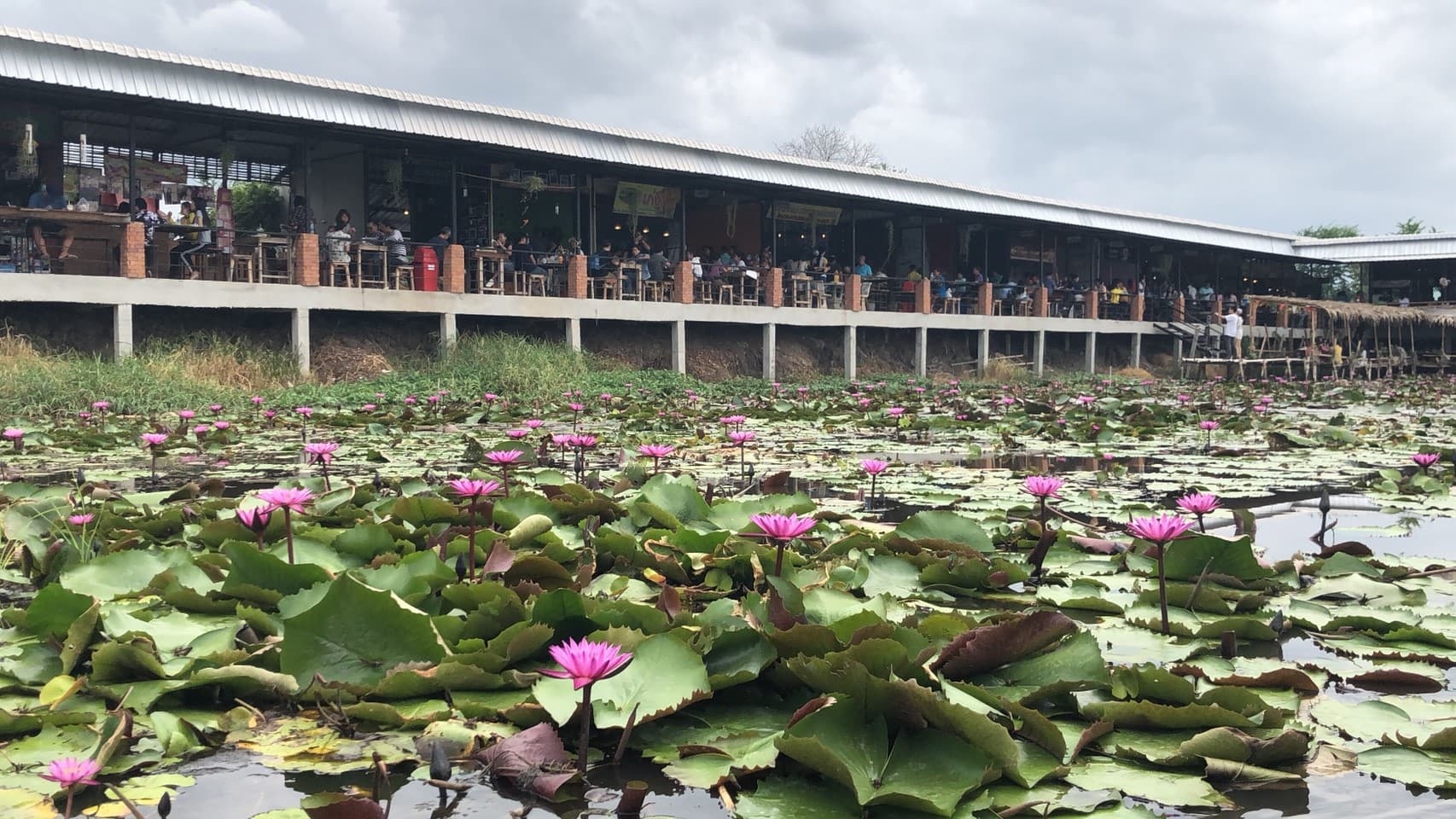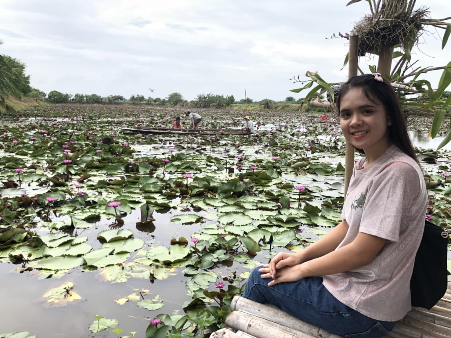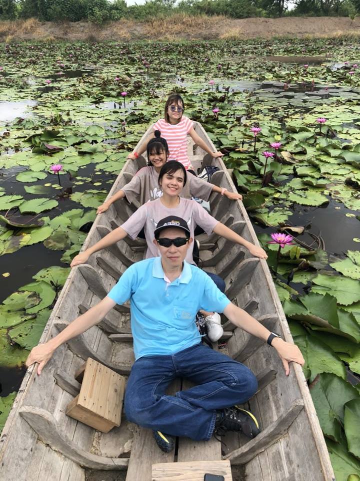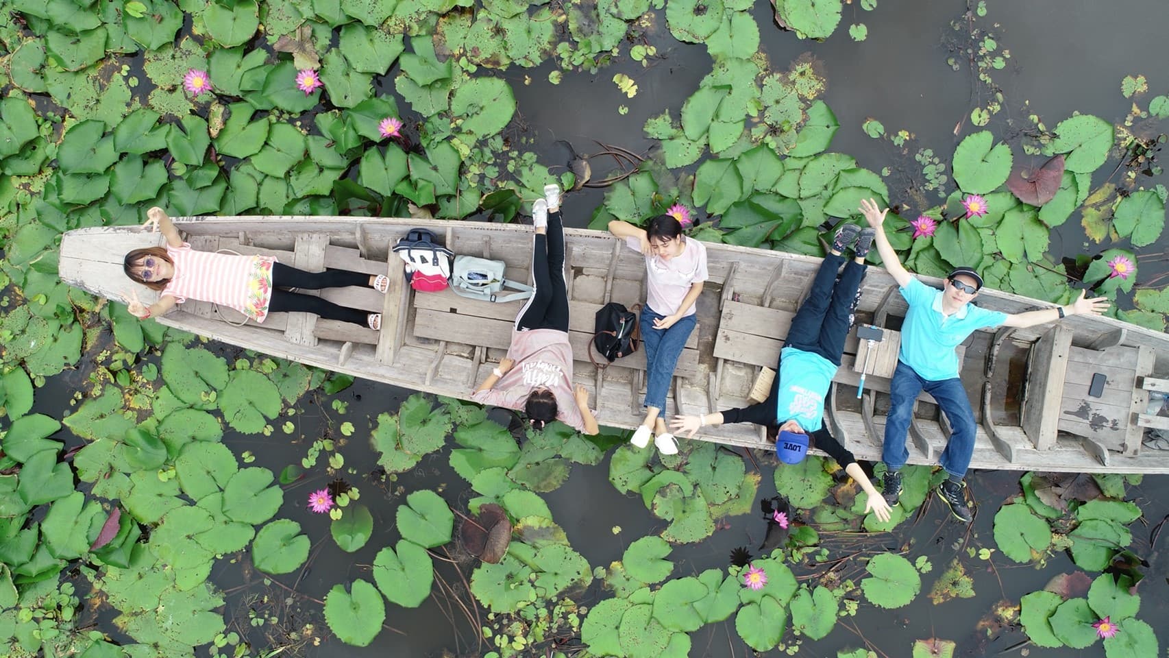 After lunch time, we were interested in sitting on the canoe and seeing the red lotus. The canoe owner gave us the promotion. That was paying 400 baht for tooking camera by the drone. We were excited very much because we had to balance on the canoe. We smiled. We laughed. This was a very good time.