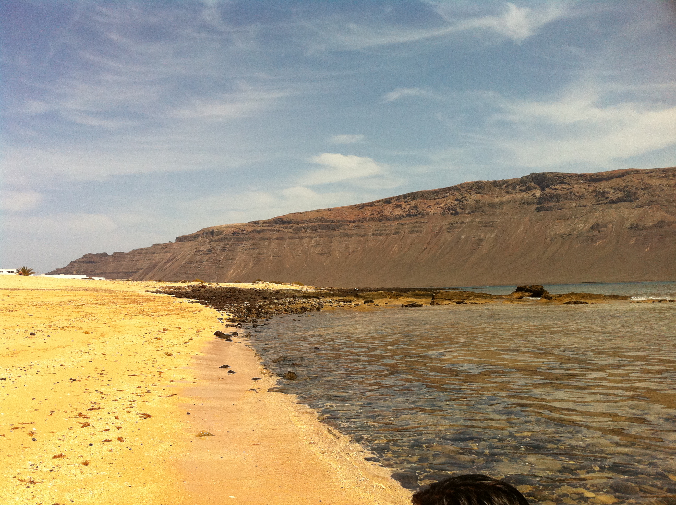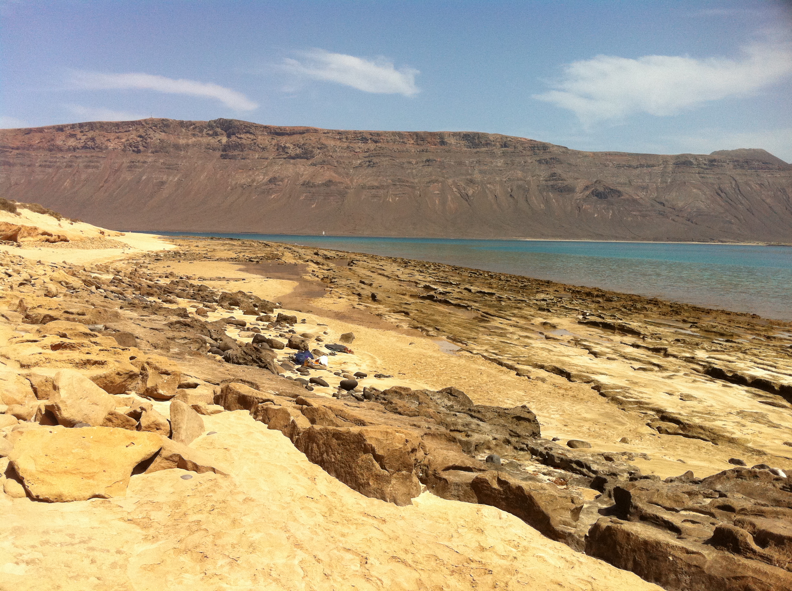 🇮🇹 Il Risco di Famara visto dall’isola de La Graciosa, geologicamente più antico come si può notare dalle linee orizzontali nella roccia dovute all’erosine del vento.